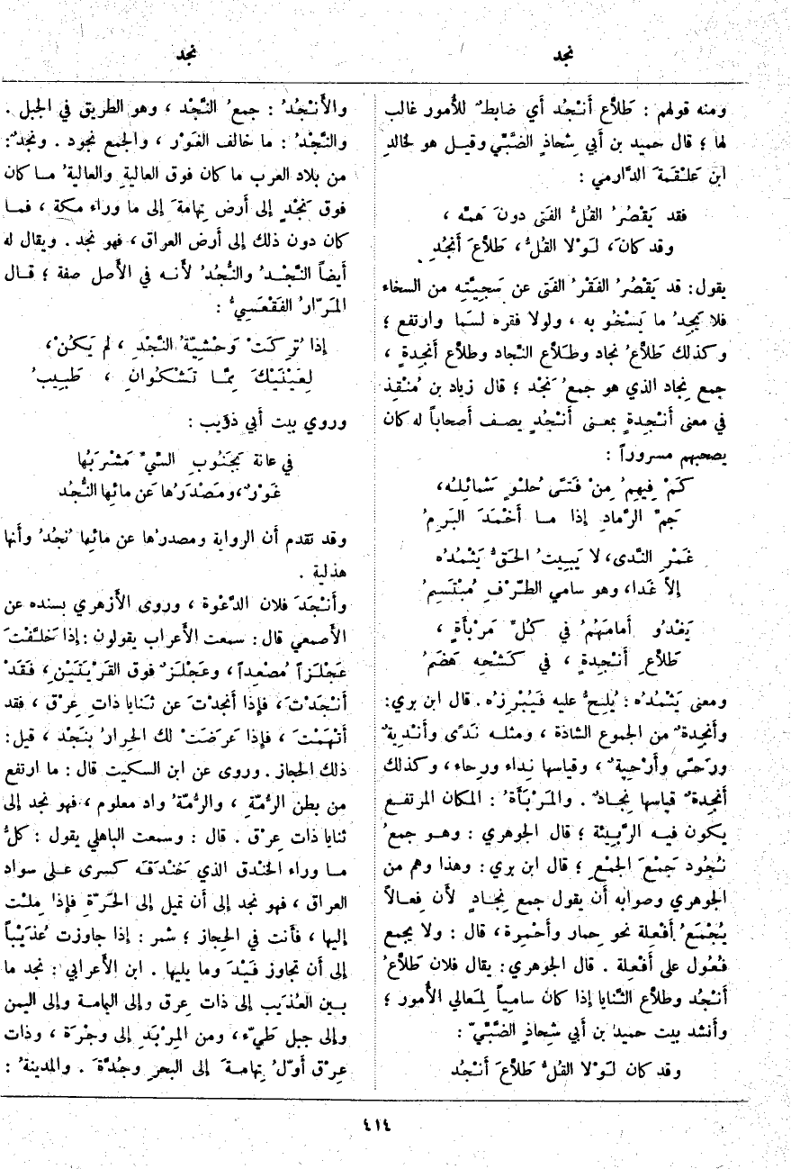 وَقَدْ تَقَدَّمَ أَن الرِّوَايَةَ ومصدرُها عَنْ مائِها نُجُدُ وأَنها هُذَلِيَّةٌ. وأَنْجَدَ فُلَانٌ الدَّعْوة، وَرَوَى الأَزهري بِسَنَدِهِ عَنْ الأَصمعي قَالَ: سَمِعْتُ الأَعراب يَقُولُونَ: إِذا خَلَّفْتَ عَجْلَزاً مُصْعِداً، وعَجْلَزٌ فَوْقَ القَرْيَتَيْنِ، فَقَدْ أَنْجَدْتَ، فإِذا أَنجدْتَ عَنْ ثَنايا ذاتِ عِرْق، فَقَدْ أَتْهَمْتَ، فإِذا عَرَضَتْ لَكَ الحِرارُ بنَجْد، قِيلَ: ذَلِكَ الْحِجَازُ. وَرُوِيَ عَنِ ابْنِ السِّكِّيتِ قَالَ: مَا ارْتَفَعَ مِنْ بَطْنِ الرُّمّةِ، والرُّمّةُ وَادٍ مَعْلُومٌ، فَهُوَ نَجْدٌ إِلى ثَنَايَا ذَاتِ عِرْق. قَالَ: وَسَمِعْتُ الْبَاهِلِيَّ يَقُولُ: كلُّ مَا وَرَاءَ الخنْدق الَّذِي خَنْدَقَه كِسْرَى عَلَى سَوَادِ الْعِرَاقِ، فَهُوَ نَجْدٌ إِلى أَن تَمِيلَ إِلى الحَرّةِ فإِذا مِلْت إِليها، فأَنت فِي الحِجاز؛ شَمِرٌ: إِذا جَاوَزْتَ عُذَيْباً إِلى أَن تُجَاوِزَ فَيْدَ وَمَا يَلِيهَا. ابْنُ الأَعرابي: نَجْدُ مَا بَيْنَ العُذَيْب إِلى ذَاتِ عِرق وإِلى الْيَمَامَةِ وإِلى اليمن وإِلى جبل طَيّء، وَمِنَ المِرْبَدِ إِلى وجْرَة، وَذَاتُ عِرْق أَوّلُ تِهامةَ إِلى البحرِ وجُدَّةَ. والمدينةُ: