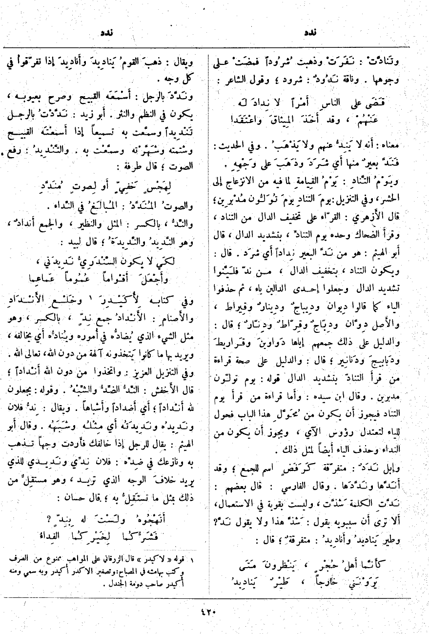 ، بِتَشْدِيدِ الدَّالِ، قَالَ أَبو الْهَيْثَمِ: هُوَ مِنْ نَدَّ الْبَعِيرُ نِداداً أَي شَرَد. قَالَ: وَيَكُونُ التَّنَادُ، بِتَخْفِيفِ الدَّالِ، مِنْ نَدَّ فلَيَّنوا تَشْدِيدَ الدَّالِ وَجَعَلُوا إِحدى الدَّالَيْنِ يَاءً، ثُمَّ حَذَفُوا الْيَاءَ كَمَا قَالُوا دِيوان ودِيباجٌ ودِينارٌ وقِيراط، والأَصل دِوَّان ودِبّاجٌ وقرّاطٌ ودِنّارٌ، قَالَ: وَالدَّلِيلُ عَلَى ذَلِكَ جَمْعُهُمُ إِياها دَواوينَ وقَراريطَ ودَبابيجَ ودَنانِير، قَالَ: وَالدَّلِيلُ عَلَى صِحَّةِ قِرَاءَةِ مَنْ قرأَ التَّنَادِّ بِتَشْدِيدِ الدَّالِ قَوْلُهُ: يَوْمَ تُوَلُّونَ مُدْبِرِينَ. وَقَالَ ابنُ سِيدَهْ: وأَما قِرَاءَةُ مَنْ قرأَ يَوْمَ التَّنَادِ فَيَجُوزُ أَن يَكُونَ مِنَ مُحَوَّلِ هَذَا الْبَابِ فَحُوِّلَ للياء لتعتدل رؤوس الْآيِ، وَيَجُوزُ أَن يَكُونَ مِنَ النِّدَاءِ وَحَذْفُ الْيَاءِ أَيضاً لِمِثْلِ ذَلِكَ. وإِبل نَدَدٌ: مُتَفَرِّقَةٌ كَرَفَضٍ اسْمٌ لِلْجَمْعِ، وَقَدْ أَنَدَّها ونَدَّدَها. وَقَالَ الْفَارِسِيُّ: قَالَ بَعْضُهُمْ: نَدَّتِ الْكَلِمَةُ شَذَّت، وَلَيْسَتْ بِقَوِيَّةٍ فِي الِاسْتِعْمَالِ، أَلا تَرَى أَن سِيبَوَيْهِ يَقُولُ: شَذَّ هَذَا وَلَا يَقُولُ نَدَّ؟ وَطَيْرٌ يَناديدُ وأَنادِيدُ: متفرقةٌ، قَالَ: