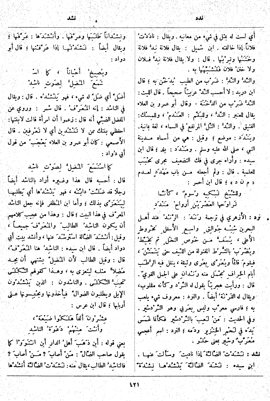 نشد: نَشَدْتُ الضَّالَّةَ إِذا ناديتَ وسَأَلتَ عَنْهَا. ابْنُ سِيدَهْ: نَشَدَ الضَّالَّةَ يَنْشُدُها نِشْدَةً ونِشْداناً طَلَبَها وعرَّفَها. وأَنْشَدَها: عَرَّفَها؛ وَيُقَالُ أَيضاً: نَشَدْتُها إِذا عَرَّفْتها؛ قَالَ أَبو دُوَادٍ: