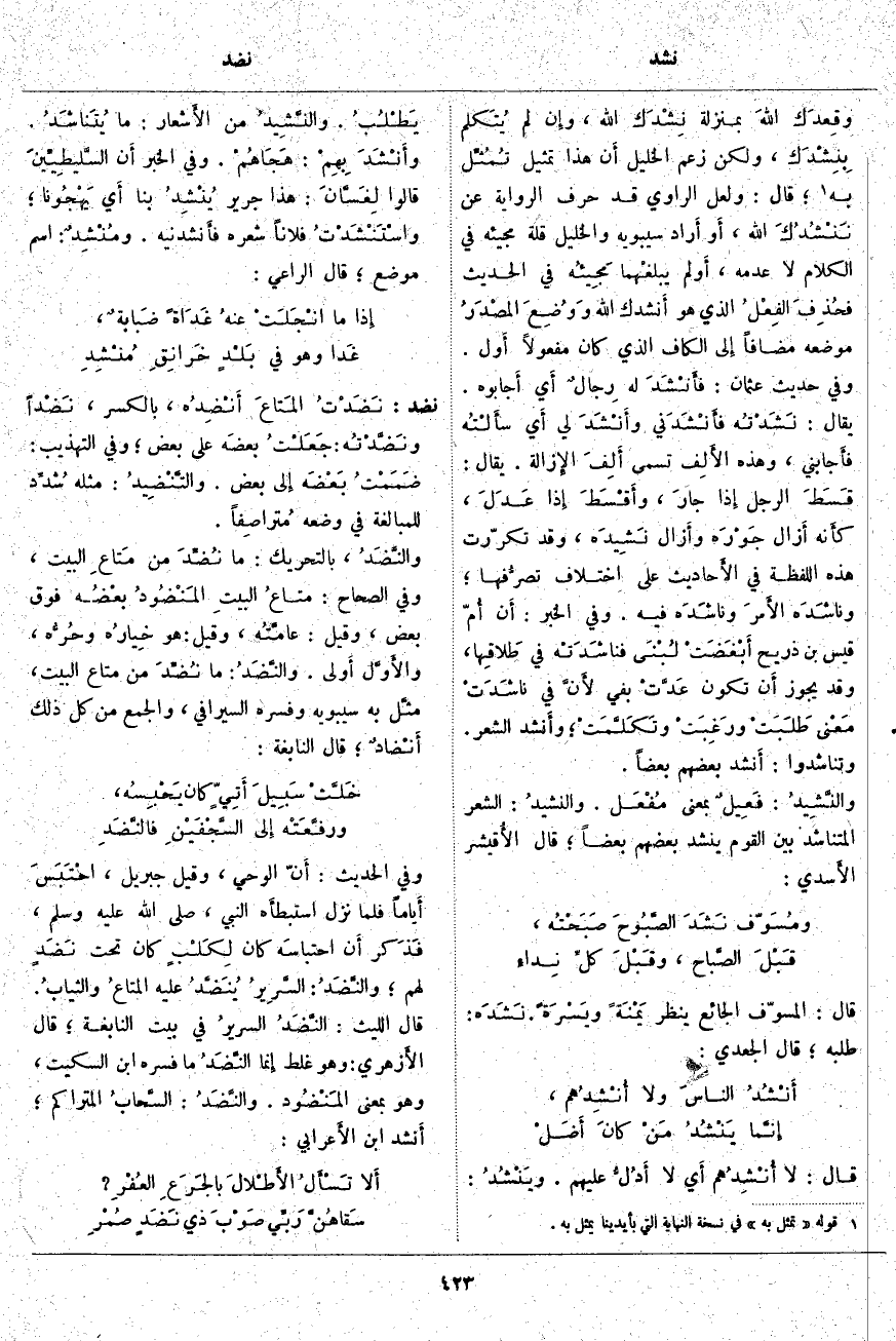 ، وَقَدْ يَجُوزُ أَن تَكُونَ عَدَّتْ بِفِي لأَنَّ فِي ناشَدَتْ مَعْنى طَلَبَتْ ورَغِبَتْ وتَكَلَّمَتْ؛ وأَنشد الشِّعْرَ. وَتَنَاشَدُوا: أَنشد بَعْضُهُمْ بَعْضًا. والنَّشِيدُ: فَعِيلٌ بِمَعْنَى مُفْعَل. والنشيدُ: الشِّعْرُ الْمُتَنَاشَدُ بَيْنَ الْقَوْمِ يَنْشُدُ بَعْضُهُمْ بَعْضًا؛ قَالَ الأُقيشر الأَسدي: