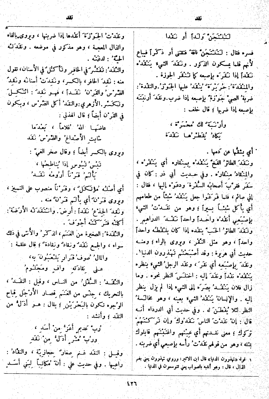 «3». ونقَدَ بِإِصْبَعِه أَي نقَرَ، ونقَد الرجلُ الشيءَ بِنَظَرِهِ يَنْقُدُه نقْداً ونقَدَ إِليه: اختلَسَ النَّظَرَ نَحْوَهُ. وَمَا زَالَ فُلَانٌ يَنْقُدُ بصَرَه إِلى الشَّيْءِ إِذا لَمْ يَزَلْ يَنْظُرُ إِليه. والإِنسانُ يَنْقُدُ الشيءَ بِعَيْنِهِ، وَهُوَ مخالَسةُ النَّظَرِ لِئَلَّا يُفْطَنَ لَهُ. وَفِي حَدِيثِ