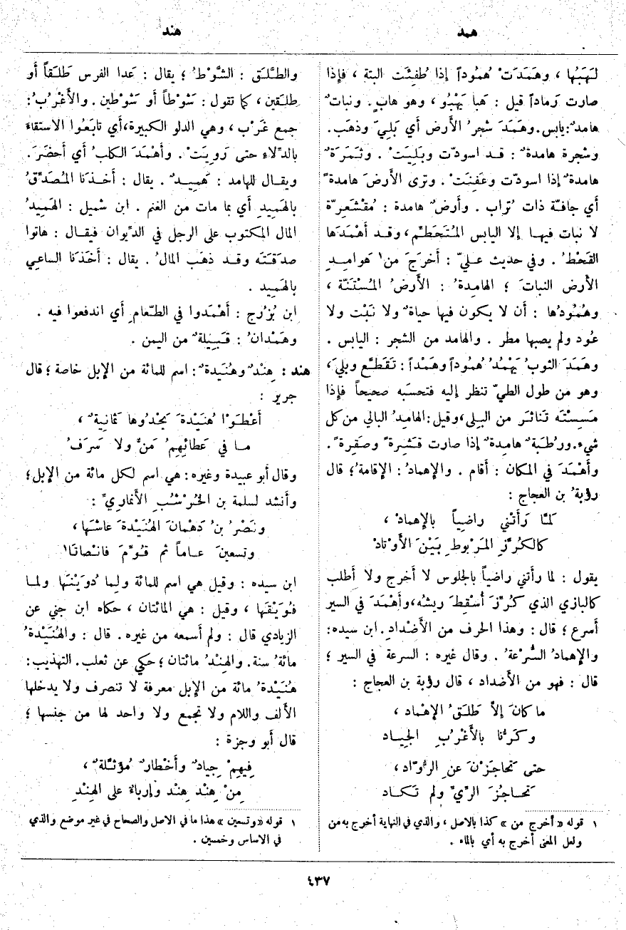 والطَّلَق: الشَّوْطُ؛ يُقَالُ: عَدا الْفَرَسُ طَلَقاً أَو طلَقين، كَمَا تَقُولُ: شَوْطاً أَو شَوْطين. والأَغْرُبُ: جَمْعُ غَرْب، وَهِيَ الدَّلْوُ الْكَبِيرَةُ، أَي تابَعُوا الاستقاءَ بالدِّلاءِ حَتَّى رَوِيَتْ. وأَهْمَدَ الكلبُ أَي أَحضَرَ. وَيُقَالُ لِلْهَامِدِ: هَمِيدٌ. يُقَالُ: أَخذَنا المُصَدِّقُ بالهَمِيدِ أَي بِمَا مَاتَ مِنَ الْغَنَمِ. ابْنُ شُمَيْلٍ: الهَمِيدُ الْمَالُ الْمَكْتُوبُ عَلَى الرَّجُلِ فِي الدِّيوان فَيُقَالُ: هَاتُوا صدَقَتَه وَقَدْ ذَهَبَ المالُ. يُقَالُ: أَخَذَنا الساعِي بالهَمِيد. ابْنُ بُزُرج: أَهْمَدوا فِي الطّعامِ أَي انْدَفَعُوا فِيهِ. وهَمْدانُ: قَبِيلةٌ من اليمن.