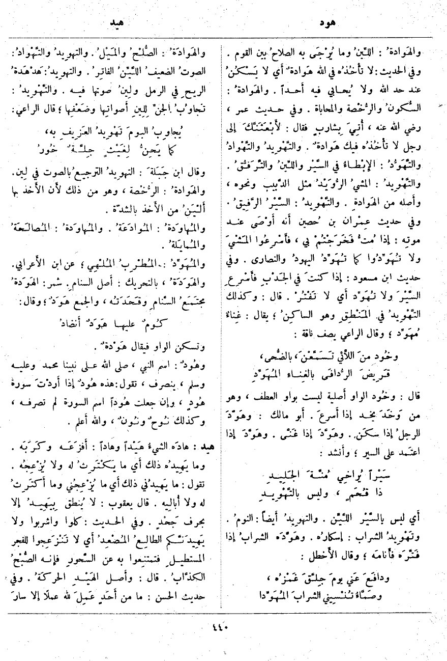 وَقَالَ ابْنُ جَبَلَةَ: التهوِيدُ الترجيعُ بِالصَّوْتِ فِي لِين. والهَوادةُ: الرُّخْصة، وَهُوَ مِنْ ذَلِكَ لأَن الأَخذ بِهَا أَلْيَنُ مِنَ الأَخذ بِالشِّدَّةِ. والمُهاوَدةُ: المُوادَعَةُ. والمُهاوَدةُ: المُصالَحَةُ والمُمايَلةُ. والمُهَوِّدُ: المُطْرِبُ المُلْهِي؛ عَنِ ابْنِ الأَعرابي. والهَوَدَةُ، بِالتَّحْرِيكِ: أَصل السنامِ. شَمِرٌ: الهَوَدةُ مجتَمَعُ السَّنامِ وقَحَدَتُه، وَالْجَمْعُ هَوَدٌ؛ وَقَالَ:
