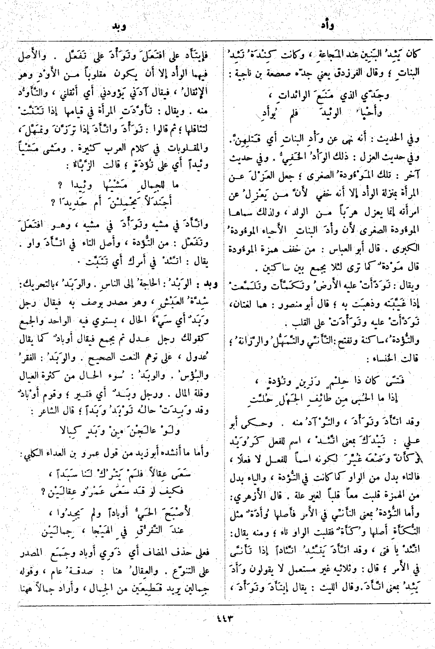 ؛ جَعَلَ العَزْلَ عَنِ المرأَة بِمَنْزِلَةِ الوأْد إِلا أَنه خَفِيٌّ لأَنَّ مَنْ يَعْزِلُ عَنِ امرأَته إِنما يَعْزِلُ هرَباً مِنَ الْوَلَدِ، وَلِذَلِكَ سَمَّاهَا الموءُودة الصُّغْرَى لأَن وأْدَ البناتِ الأَحياء الموءُودةُ الْكُبْرَى. قَالَ أَبو الْعَبَّاسِ: مَنْ خَفَّفَ هَمْزَةَ الموءُودة قَالَ مَوْدةٌ كَمَا تَرَى لِئَلَّا يُجْمَعَ بَيْنَ سَاكِنَيْنِ. وَيُقَالُ: تَوَدّأَتْ عَلَيْهِ الأَرضُ وتَكَمَّأَت وتَلَمَّعتْ إِذا غَيَّبَته وذهبَت بِهِ؛ قَالَ أَبو مَنْصُورٍ؛ هُمَا لُغَتَانِ، تَوَدَّأَتْ عَلَيْهِ وتَوَأْدَتْ عَلَى الْقَلْبِ. والتؤْدةُ، سَاكِنَةٌ وَتُفْتَحُ: التَّأَنِّي والتَّمَهُّلُ والرَّزانةُ؛ قَالَتِ الْخَنْسَاءُ: