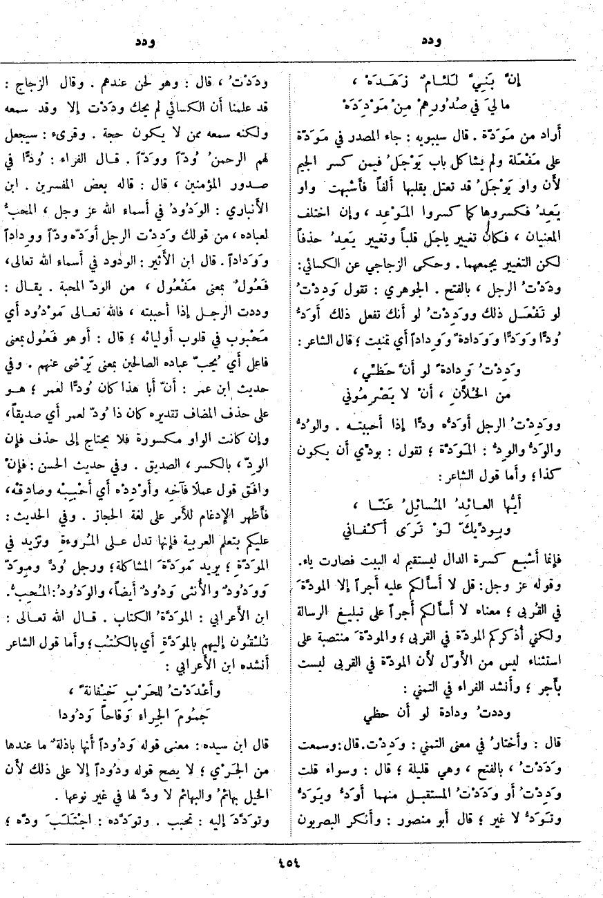 أَراد مِنْ مَوَدّة. قَالَ سِيبَوَيْهِ: جَاءَ الْمَصْدَرُ فِي مَوَدّة عَلَى مَفْعَلة وَلَمْ يُشَاكِلْ بَابَ يَوْجَلُ فِيمَنْ كَسَرَ الْجِيمَ لأَن وَاوَ يَوْجَلُ قَدْ تَعْتَلُّ بِقَلْبِهَا أَلفاً فأَشبهت وَاوَ يَعِدُ فَكَسَرُوهَا كَمَا كَسَرُوا المَوْعِد، وإِن اخْتَلَفَ الْمَعْنَيَانِ، فَكَانَ تَغْيِيرُ ياجَل قَلْبًا وَتَغْيِيرُ يَعِدُ حَذْفًا لَكِنَّ التَّغْيِيرَ يَجْمَعُهُمَا. وَحَكَى الزجاجي عن الكسائي: ودَدْتُ الرَّجُلَ، بِالْفَتْحِ. الْجَوْهَرِيُّ: تَقُولُ وَدِدْتُ لَوْ تَفْعَل ذَلِكَ ووَدِدْتُ لَوْ أَنك تَفْعَلُ ذَلِكَ أَوَدُّ وُدًّا وَوَدًّا وَوَدادةً، وَوِداداً أَي تَمَنَّيْتُ؛ قَالَ الشَّاعِرُ: