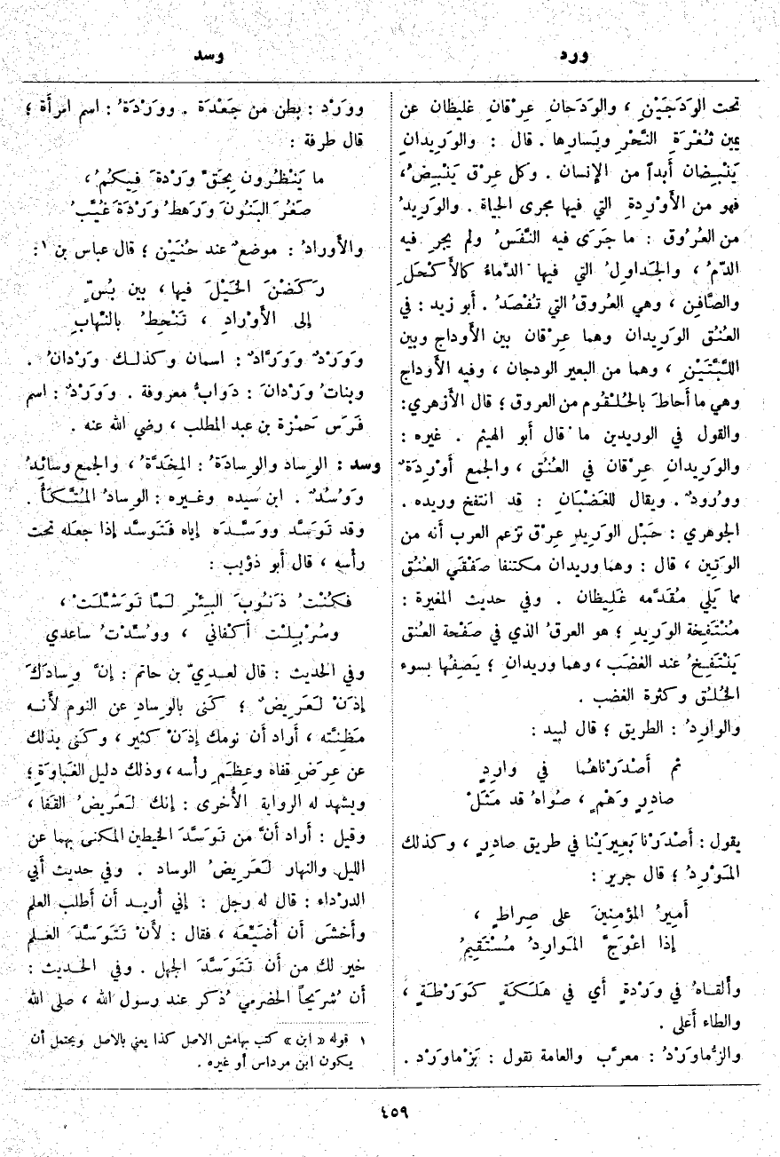 تَحْتَ الوَدَجَيْنِ، والوَدَجانِ عِرْقانِ غَلِيظَانِ عَنْ يَمِينِ ثُغْرَةِ النَّحْرِ ويَسارِها. قَالَ: والوَرِيدانِ يَنْبِضان أَبداً منَ الإِنسان. وَكُلُّ عِرْق يَنْبِضُ، فَهُوَ مِنَ الأَوْرِدةِ الَّتِي فِيهَا مَجْرَى الْحَيَاةِ. والوَرِيدُ مِنَ العُرُوق: مَا جَرَى فِيهِ النَّفَسُ وَلَمْ يجرِ فِيهِ الدّمُ، والجَداوِلُ الَّتِي فِيهَا الدِّماءُ كالأَكْحَلِ والصَّافِن، وَهِيَ العُروقُ الَّتِي تُفْصَدُ. أَبو زَيْدٍ: فِي العُنُق الوَرِيدان وَهُمَا عِرْقان بَيْنَ الأَوداج وَبَيْنَ اللَّبَّتَيْنِ، وَهُمَا مِنَ الْبَعِيرِ الْوَدَجَانِ، وَفِيهِ الأَوداج وَهِيَ مَا أَحاطَ بالحُلْقُوم مِنَ الْعُرُوقِ؛ قَالَ الأَزهري: وَالْقَوْلُ فِي الْوَرِيدَيْنِ مَا قَالَ أَبو الْهَيْثَمِ. غَيْرُهُ: والوَرِيدانِ عِرْقان فِي العُنُق، وَالْجَمْعُ أَوْرِدَةٌ ووُرودٌ. وَيُقَالُ للغَضْبَانِ: قَدِ انْتَفَخَ وَرِيدُهُ. الْجَوْهَرِيُّ: حَبْل الوَرِيدِ عِرْق تَزْعُمُ الْعَرَبُ أَنه مِنْ الوَتِين، قَالَ: وَهُمَا وَرِيدَانِ مُكْتَنِفَا صَفْقَي العُنُق مِمَّا يَلي مُقَدَّمه غَلِيظان. وَفِي حَدِيثِ الْمُغِيرَةِ: