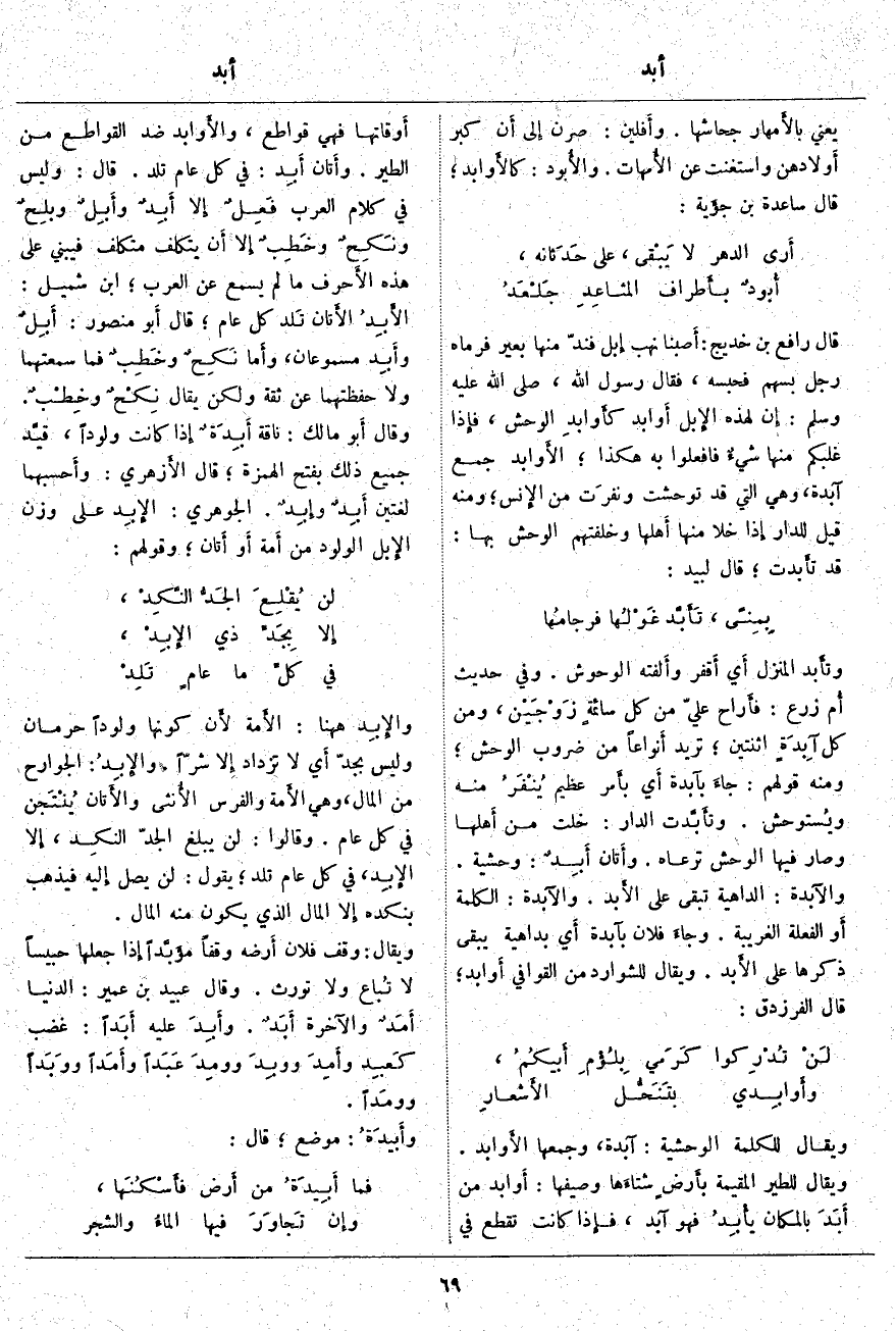 والإِبِد هَاهُنَا: الأَمة لأَن كَوْنَهَا وَلُودًا حِرْمَانٌ وَلَيْسَ بِجَدٍّ أَي لَا تَزْدَادُ إِلا شَرًّا. والإِبِدُ: الْجَوَارِحُ مِنَ الْمَالِ، وَهِيَ الأَمة وَالْفَرَسُ الأُنثى والأَتان يُنْتَجن فِي كُلِّ عَامٍ. وَقَالُوا: لَنْ يَبْلُغَ الْجَدُّ النكِد، إِلا الإِبِد، فِي كُلِّ عَامٍ تَلِدُ؛ يَقُولُ: لَنْ يَصِلَ إِليه فَيَذْهَبُ بِنَكَدِهِ إِلا الْمَالُ الَّذِي يَكُونُ مِنْهُ الْمَالُ. وَيُقَالُ: وَقَفَ فُلَانٌ أَرضه وَقْفًا مؤَبَّداً إِذا جَعَلَهَا حَبِيسًا لَا تُباع وَلَا تُورَثُ. وَقَالَ عُبَيْدُ بْنُ عُمَيْرٍ: الدُّنْيَا أَمَدٌ وَالْآخِرَةُ أَبَدٌ. وأَبِدَ عَلَيْهِ أَبَداً: غَضِبَ كَعَبِد وأَمِدَ ووبِدَ وومِدَ عَبَداً وأَمَداً ووَبَداً وومَداً. وأَبيدَةُ: مَوْضِعٌ؛ قَالَ: