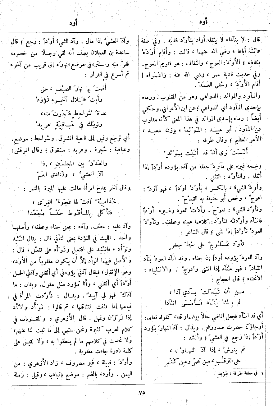 وَآدَ العشيُّ إِذا مَالَ. وَآدَ الشيءُ أَوْداً: رَجَعَ؛ قَالَ سَاعِدَةُ بْنُ الْعَجْلَانِ يَصِفُ أَنه لَقِيَ رَجُلًا مِنْ خُصُومِهِ فَفَرَّ مِنْهُ وَاسْتَتَرَ، فِي مَوْضِعٍ نهارَه إِلى قَرِيبٍ مِنْ آخِرِهِ ثُمَّ أَسرع فِي الْفِرَارِ: