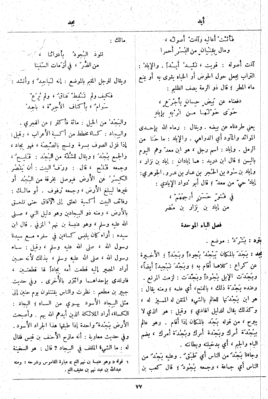 والبَجْدُ مِنَ الْخَيْلِ: مِائَةٌ فأَكثر؛ عَنِ الْهِجْرِيِّ. والبِجاد: كساءٌ مُخَطَّطٌ مِنْ أَكسية الأَعراب، وَقِيلَ: إِذا غُزِلَ الصُّوفُ بِسُرَّةٍ وَنُسِجَ بالصِّيصَة، فَهُوَ بِجاد، وَالْجَمْعُ بُجُدٌ؛ وَيُقَالُ للشُّقَّة مِنَ البُجُد: قَليحٌ، وَجَمْعُهُ قُلُح، قَالَ: ورَفُّ الْبَيْتِ: أَن يَقْصُر الكِسْرُ عَنِ الأَرض فَيُوَصِّلُ بِخِرْقَةٍ مِنَ البُجُد أَو غَيْرِهَا لِيَبْلُغَ الأَرض، وَجَمْعُهُ رُفوف. أَبو مَالِكٍ: رَفَائِفُ الْبَيْتِ أَكسية تُعَلَّقُ إِلى الْآفَاقِ حَتَّى تَلْحَقَ بالأَرض، وَمِنْهُ ذُو البِجادين وَهُوَ دَلِيلُ النَّبِيِّ، صَلَّى اللَّهُ عَلَيْهِ وَسَلَّمَ، وَهُوَ عَنْبَسَةُ بْنُ نَهَمٍ «1». الْمُزَنِي. قَالَ ابْنُ سِيدَهْ: أُراه كَانَ يَلْبَسُ كساءَين فِي سَفَرِهِ مَعَ سَيِّدِنَا رَسُولِ اللَّهِ، صَلَّى اللَّهُ عَلَيْهِ وَسَلَّمَ، وَقِيلَ: سَمَّاهُ رسول الله، صلى الله عَلَيْهِ وَسَلَّمَ، بِذَلِكَ لأَنه حِينَ أَراد الْمَصِيرَ إِليه قَطَعَتْ أُمه بِجاداً لَهَا قِطْعَتَيْنِ، فَارْتَدَى بإِحداهما وَائْتَزَرَ بالأُخرى. وَفِي حَدِيثِ