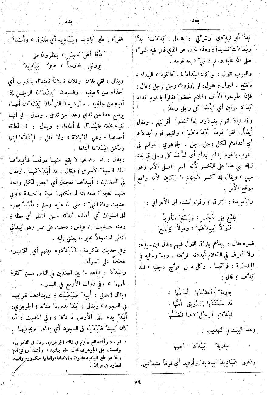 فَسَّرَهُ فَقَالَ: يبدُّهم يفرِّق الْقَوْلَ فِيهِمْ؛ قَالَ ابْنُ سِيدَهْ: وَلَا أَعرف فِي الْكَلَامِ أَبددته فرَّقته. وبدَّ رِجْلَيْهِ فِي المِقطَرة: فرَّقهما. وَكُلُّ مَنْ فرَّج رِجْلَيْهِ، فَقَدْ بَدَّهما؛ قَالَ: