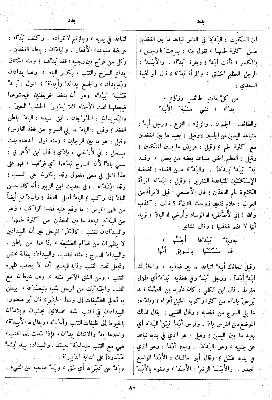 وَقِيلَ لِلْحَائِكِ أَبَدُّ لِتَبَاعُدِ مَا بَيْنَ فَخِذَيْهِ، وَالْحَائِكُ أَبَدُّ أَبَداً. وَرَجُلٌ أَبَدُّ وَفِي فَخِذَيْهِ بَدَدٌ أَي طُولٌ مُفْرِطٌ. قَالَ ابْنُ الْكَلْبِيِّ: كَانَ دُريد بْنُ الصِّمَّة قَدْ بَرِصَ بَادَّاهُ مِنْ كَثْرَةِ رُكُوبِهِ الْخَيْلَ أَعراء؛ وَبَادَّاهُ: مَا يَلِي السَّرْجَ مِنْ فَخِذَيْهِ؛ وَقَالَ الْقُتَيْبِيُّ: يُقَالُ لِذَلِكَ الْمَوْضِعِ مِنَ الْفَرَسِ بَادَّ. وَفَرَسٌ أَبَدُّ بَيِّنُ البَدَد أَي بَعِيدُ مَا بَيْنَ الْيَدَيْنِ؛ وَقِيلَ: هُوَ الَّذِي فِي يَدَيْهِ تَبَاعُدٌ عَنْ جَنْبَيْهِ، وَهُوَ البَدَدُ. وَبَعِيرٌ أَبَدُّ: وَهُوَ الَّذِي فِي يَدَيْهِ فَتَل؛ وَقَالَ أَبو مَالِكٍ: الأَبَدُّ الْوَاسِعُ الصَّدْرِ. والأَبَدُّ الزنيمُ: الأَسَدُ، وَصَفْوَةٌ بالأَبَدِّ لِتَبَاعُدٍ فِي يَدَيْهِ، وَبِالزَّنِيمِ لِانْفِرَادِهِ. وَكَتِفٌ بَدَّاء: عَرِيضَةٌ مُتَبَاعِدَةُ الأَقطار. وَالْبَادَّانِ: بَاطِنَا الْفَخِذَيْنِ. وَكُلُّ مَنْ فرَّج بَيْنَ رِجْلَيْهِ، فَقَدَّ بَدَّهما؛ وَمِنْهُ اشْتِقَاقُ بِدادِ السَّرْجِ وَالْقَتَبِ، بِكَسْرِ الْبَاءِ، وَهَمَا بِدادان وبَدِيدان، وَالْجَمْعُ بدائدُ وأَبِدَّةٌ؛ تَقُولُ: بَدَّ قَتَبَهُ يَبُدُّه وَهُوَ أَن يَتَّخِذَ خَرِيطَتَيْنِ فَيَحْشُوهُمَا فَيَجْعَلُهُمَا تَحْتَ الأَحناء لِئَلَّا يُدْبِر الخشبُ البعيرَ. والبَدِيدانِ: الخُرْجان. ابْنُ سِيدَهْ: الْبَادُّ بَاطِنُ الْفَخِذِ؛ وَقِيلَ: الْبَادُّ مَا يَلِي السَّرْجَ مِنْ فَخِذِ الْفَارِسِ؛ وَقِيلَ: هُوَ مَا بَيْنَ الرِّجْلَيْنِ؛ وَمِنْهُ قَوْلُ الدهناءِ بِنْتِ مِسحل: إِني لأُرْخِي لَهُ بَادِّي؛ قَالَ ابْنُ الأَعرابي: سُمِّيَ بَادًّا لأَن السَّرْجَ بَدَّهما أَي فرَّقهما، فَهُوَ عَلَى هَذَا فَاعِلٌ فِي مَعْنَى مَفْعُولٍ وَقَدْ يَكُونُ عَلَى النَّسَبِ؛ وَقَدِ ابْتَدَّاه. وَفِي حَدِيثِ
