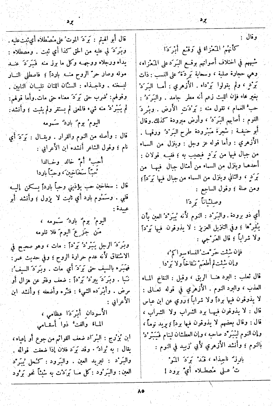 ، قَالَ: وَقَالَ بَعْضُهُمْ لَا يَذُوقُونَ فِيهَا بَرْدًا، يُرِيدُ نَوْمًا، وإِن النَّوْمَ ليُبَرِّد صَاحِبَهُ، وإِن الْعَطْشَانَ لَيَنَامُ فَيَبْرُدُ بِالنَّوْمِ؛ وأَنشد الأَزهري لأَبي زُبيد فِي النَّوْمِ: