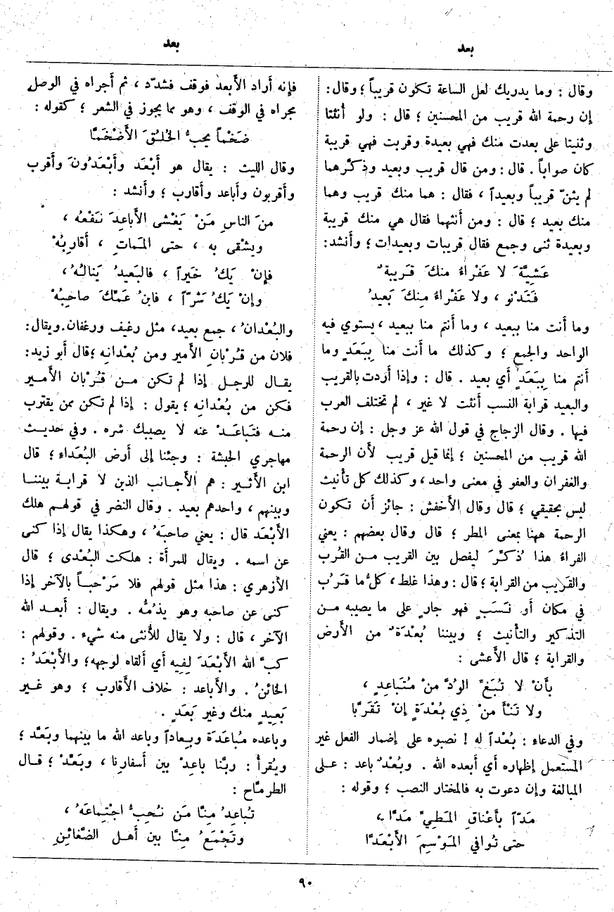 وَمَا أَنت مِنَّا بِبَعِيدٍ، وَمَا أَنتم مِنَّا بِبَعِيدٍ، يَسْتَوِي فِيهِ الْوَاحِدُ وَالْجَمْعُ؛ وَكَذَلِكَ مَا أَنت مِنَّا بِبَعَدٍ وَمَا أَنتم مِنَّا بِبَعَدٍ أَي بَعِيدٌ. قَالَ: وإِذا أَردت بِالْقَرِيبِ وَالْبَعِيدِ قَرَابَةَ النَّسَبِ أَنثت لَا غَيْرَ، لَمْ تَخْتَلِفِ الْعَرَبُ فِيهَا. وَقَالَ الزَّجَّاجُ فِي قَوْلِ اللَّهِ عَزَّ وَجَلَّ: إِنَّ رَحْمَتَ اللَّهِ قَرِيبٌ مِنَ الْمُحْسِنِينَ؛ إِنما قِيلَ قَرِيبٌ لأَن الرَّحْمَةَ وَالْغُفْرَانَ وَالْعَفْوَ فِي مَعْنًى وَاحِدٍ، وَكَذَلِكَ كُلُّ تأْنيث لَيْسَ بِحَقِيقِيٍّ؛ قَالَ وَقَالَ الأَخفش: جَائِزٌ أَن تَكُونَ الرَّحْمَةُ هَاهُنَا بِمَعْنَى الْمَطَرِ؛ قَالَ وَقَالَ بَعْضُهُمْ: يَعْنِي الفراءُ هَذَا ذُكِّرَ لِيَفْصِلَ بَيْنَ الْقَرِيبِ مِنَ القُرب والقَريب مِنَ الْقَرَابَةِ؛ قَالَ: وَهَذَا غَلَطٌ، كلُّ مَا قَرُب فِي مَكَانٍ أَو نَسَبٍ فَهُوَ جارٍ عَلَى مَا يُصِيبُهُ مِنَ التَّذْكِيرِ والتأْنيث؛ وَبَيْنَنَا بُعْدَةٌ مِنَ الأَرض وَالْقَرَابَةِ؛ قَالَ الأَعشى: بأَنْ لَا تُبَغِّ الوُدَّ منْ مُتَباعِدٍ، وَلَا تَنْأَ منْ ذِي بُعْدَةٍ إِنْ تَقَرَّبا وَفِي الدعاءِ: بُعْداً لَهُ نَصَبُوهُ عَلَى إِضمار الْفِعْلِ غَيْرِ الْمُسْتَعْمَلِ إِظهاره أَي أَبعده اللَّهُ. وبُعْدٌ بَاعَدٌ: عَلَى الْمُبَالَغَةِ وإِن دَعَوْتَ بِهِ فَالْمُخْتَارُ النَّصْبُ؛ وَقَوْلُهُ: