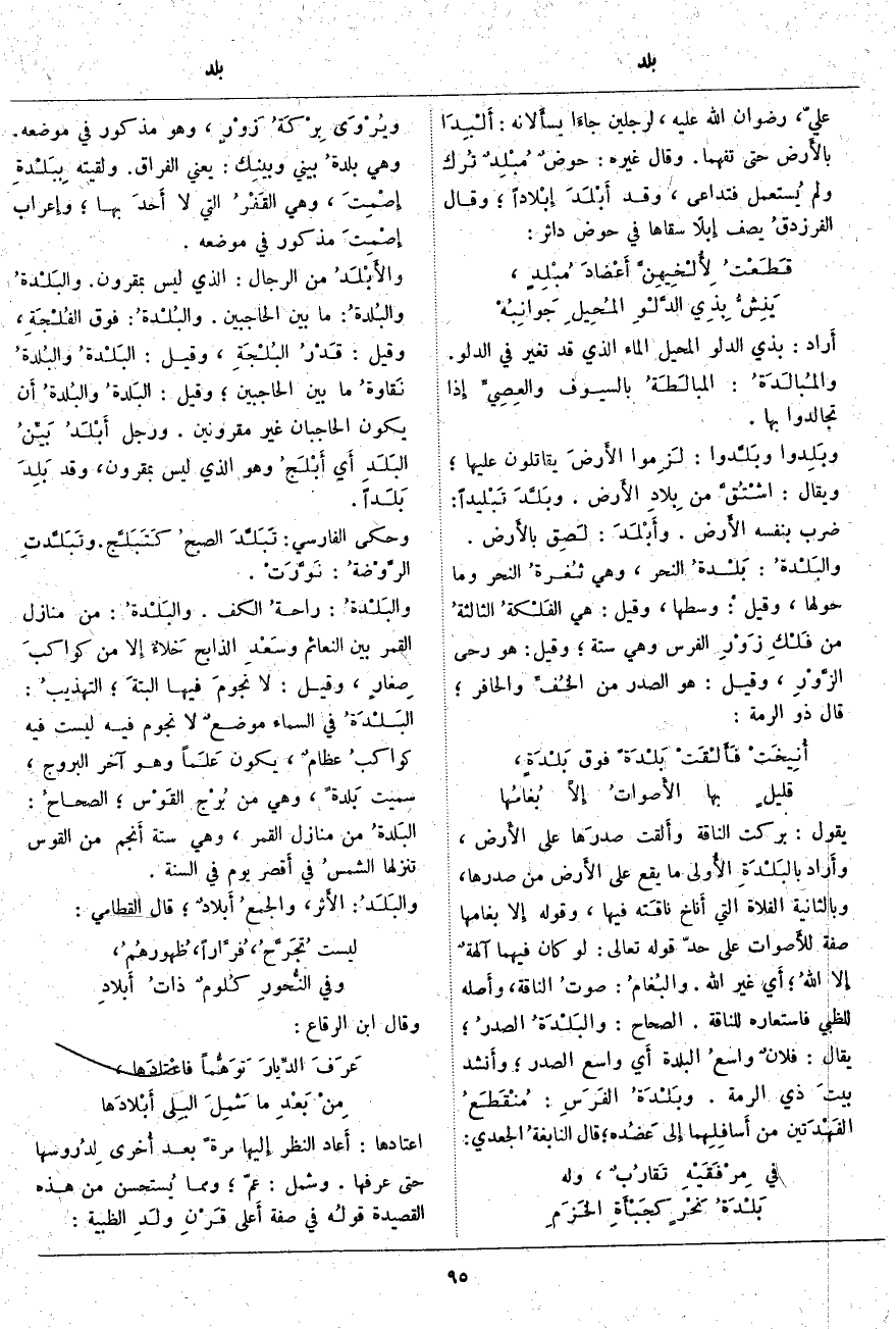 ويُرْوَى بِرْكَةُ زَوْرٍ، وَهُوَ مَذْكُورٌ فِي مَوْضِعِهِ. وَهِيَ بلدةُ بَيْنِي وَبَيْنَكَ: يَعْنِي الْفِرَاقَ. وَلَقِيتُهُ بِبَلْدةِ إِصْمِتَ، وَهِيَ القَفْرُ الَّتِي لَا أَحدَ بِهَا؛ وإِعراب إِصْمِتَ مَذْكُورٌ فِي مَوْضِعِهِ. والأَبْلَدُ مِنَ الرِّجَالِ: الَّذِي لَيْسَ بِمَقْرُونٍ. والبَلْدةُ والبُلدةُ: مَا بَيْنَ الْحَاجِبَيْنِ. والبُلْدةُ: فَوْقَ الفُلْجَةِ، وَقِيلَ: قَدْرُ البُلْجَةِ، وَقِيلَ: البَلْدَةُ والبُلْدةُ نَقاوةُ مَا بَيْنَ الْحَاجِبَيْنِ؛ وَقِيلَ: البَلدةُ والبُلدةُ أَن يَكُونَ الْحَاجِبَانِ غَيْرَ مَقْرُونَيْنِ. ورجل أَبْلَدُ بَيِّنُ البَلَدِ أَي أَبْلَجُ وَهُوَ الَّذِي لَيْسَ بِمَقْرُونٍ، وَقَدْ بَلِدَ بَلَداً. وَحَكَى الْفَارِسِيُّ: تَبَلَّدَ الصبحُ كَتَبَلَّج. وتَبَلَّدتِ الرَّوْضةُ: نَوَّرَتْ. والبَلْدةُ: راحةُ الْكَفِّ. والبَلْدةُ: مِنْ مَنَازِلِ الْقَمَرِ بَيْنَ النَّعَائِمِ وسَعْدِ الذَّابِحِ خَلاءٌ إِلا مِنْ كواكبَ صغارٍ، وَقِيلَ: لَا نَجومَ فِيهَا البتةَ؛ التهذيبُ: البَلْدَةُ فِي السَّمَاءِ موضعٌ لَا نُجُومَ فِيهِ لَيْسَتْ فِيهِ كواكبُ عظامٌ، يَكُونُ عَلَماً وَهُوَ آخِرُ الْبُرُوجِ، سُمِّيتْ بَلدةً، وَهِيَ مِنْ بُرْج القَوْس؛ الصحاحُ: البَلدةُ مِنْ مَنَازِلِ الْقَمَرِ، وَهِيَ سِتَّةٌ أَنجم مِنَ الْقَوْسِ تَنْزِلُهَا الشمسُ فِي أَقصر يَوْمٍ فِي السَّنَةِ. والبَلَدُ: الأَثر، والجمعُ أَبلادٌ؛ قَالَ الْقُطَامِيُّ: