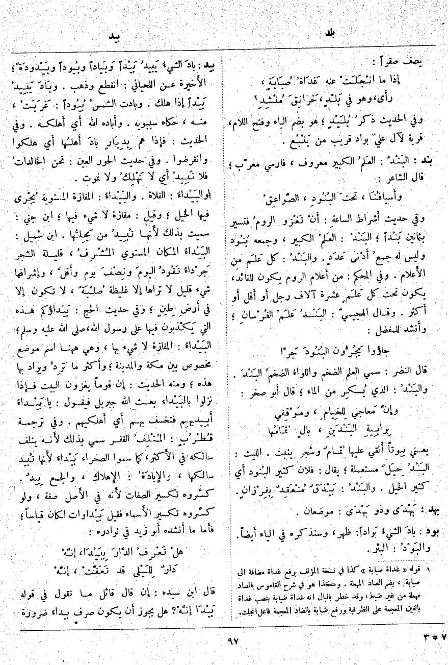 أَي أَهلكيهم. وَفِي تَرْجَمَةِ قُطْرُبٍ: المُتْلِفُ الْقَفْرُ سُمِّيَ بِذَلِكَ لأَنه يُتْلِفُ سَالِكَهُ فِي الأَكثر، كَمَا سَمُّوا الصَّحْرَاءَ بَيْداءَ لأَنها تُبيد سَالِكَهَا، والإِبادَةُ: الإِهلاك، وَالْجَمْعُ بِيدٌ. كسَّروه تَكْسِيرَ الصِّفَاتِ لأَنه فِي الأَصل صِفَةٌ، وَلَوْ كسَّروه تَكْسِيرَ الأَسماء فَقِيلَ بَيْداوات لَكَانَ قَيَاسًا، فأَما مَا أَنْشَدَهُ أَبو زَيْدٍ فِي نَوَادِرِهِ:
