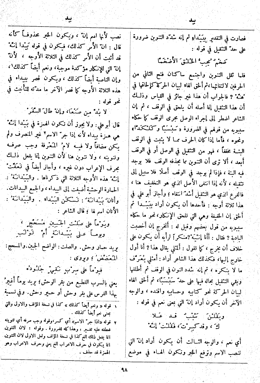 فَلَمَّا ثَقُلَ التَّنْوِينُ وَاجْتَمَعَ سَاكِنَانِ فَتَحَ الثَّانِي مِنَ الْحَرْفَيْنِ لِالْتِقَائِهِمَا، ثُمَّ أَلحق الهاءَ لِبَيَانِ الْحَرَكَةِ كإِلحاقها فِي هُنَّهْ؟ فَالْجَوَابُ أَن هَذَا غَيْرُ جَائِزٍ فِي الْقِيَاسِ وَذَلِكَ أَن هَذَا التَّثْقِيلَ إِنما أَصله أَن يَلْحَقَ فِي الْوَقْفِ، ثُمَّ إِن الشَّاعِرَ اضْطُرَّ إِلى إِجراء الْوَصْلَ مُجْرَى الْوَقْفِ كَمَا حَكَاهُ سِيبَوَيْهِ مِنْ قَوْلِهِمْ فِي الضَّرُورَةِ" سَبْسَبَّا وكَلْكَدَّا وَنَحْوَهُ، فأَما إِذا كَانَ الْحَرْفُ مِمَّا لَا يَثْبُتُ فِي الْوَقْفِ الْبَتَّةَ مُخَفَّفًا، فَهُوَ مِنَ التَّثْقِيلِ فِي الْوَصْلِ أَو فِي الْوَقْفِ أَبعد، أَلا تَرَى أَن التَّنْوِينَ مِمَّا يَحْذِفُهُ الْوَقْفُ فَلَا يُوجَدُ فِيهِ الْبَتَّةَ، فإِذا لَمْ يُوجَدْ فِي الْوَقْفِ أَصلًا فَلَا سَبِيلَ إِلى تَثْقِيلِهِ، لأَنه إِذا انْتَفَى الأَصل الَّذِي هُوَ التَّخْفِيفُ هُنَا، فَالْفَرْعُ الَّذِي هُوَ التَّثْقِيلُ أَشدّ انْتِفَاءً، وأَجاز أَبو عَلِيٍّ فِي هَذَا ثَلَاثَةَ أَوجه: فأَحدها أَن يَكُونَ أَراد ببَيْدا ثُمَّ أَلحق إِن الْخَفِيفَةَ وَهِيَ الَّتِي تَلْحَقُ الإِنكار، نَحْوَ مَا حَكَاهُ سِيبَوَيْهِ مِنْ قَوْلِ بَعْضِهِمْ وَقِيلَ لَهُ: أَتخرج إِن أَخصبت الْبَادِيَةُ؟ فَقَالَ: أَأَنا إِنِّيَهْ؟ مُنْكِرًا لرأْيه أَن يَكُونَ عَلَى خِلَافِ أَن يَخْرُجَ، كَمَا تَقُولُ: أَلمثلي يُقَالُ هَذَا؟ أَنا أَول خَارِجٍ إِليها، فَكَذَلِكَ هَذَا الشَّاعِرُ أَراد: أَمثلي يُعَرَّف مَا لَا يُنْكِرُهُ، ثُمَّ إِنه شَدَّدَ النُّونَ فِي الْوَقْفِ ثُمَّ أَطلقها وَبَقِيَ التَّثْقِيلُ بِحَالِهِ فِيهَا عَلَى حَدِّ سَبْسَبَّا، ثُمَّ أَلحق الْهَاءَ لِبَيَانِ الْحَرَكَةِ نَحْوَ كِتَابِيَهْ وَحِسَابِيَهْ وَاقْتَدِهِ، وَالْوَجْهُ الْآخَرُ أَن يَكُونَ أَراد إِنّ الَّتِي بِمَعْنَى نَعَمْ فِي قَوْلِهِ: