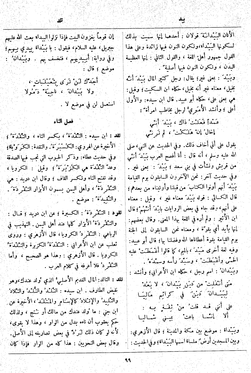 تلد: التَّالِدُ: الْمَالُ الْقَدِيمُ الأَصلِيُّ الَّذِي وُلد عِنْدَكَ، وَهُوَ نَقِيضُ الطَّارِفِ. ابْنُ سِيدَهْ: التَّلْدُ والتُّلْدُ والتِّلادُ والتَّلِيدُ والإِتْلادُ كالإِسْنامِ والمُتْلَدُ، الأَخيرة عَنِ ابْنِ جِنِّي: مَا وُلد عِنْدَكَ مِنْ مَالِكٍ أَو نُتج، وَلِذَلِكَ حَكَمَ يَعْقُوبُ أَن تَاءَهُ بَدَلٌ مِنَ الْوَاوِ، وَهَذَا لَا يَقْوَى، لأَنه لَوْ كَانَ ذَلِكَ لَرُدَّ فِي بَعْضِ تَصَارِيفِهِ إِلى الأَصل. وَقَالَ بَعْضُ النَّحْوِيِّينَ: هَذَا كُلُّهُ مِنَ الْوَاوِ فإِذا كَانَ
