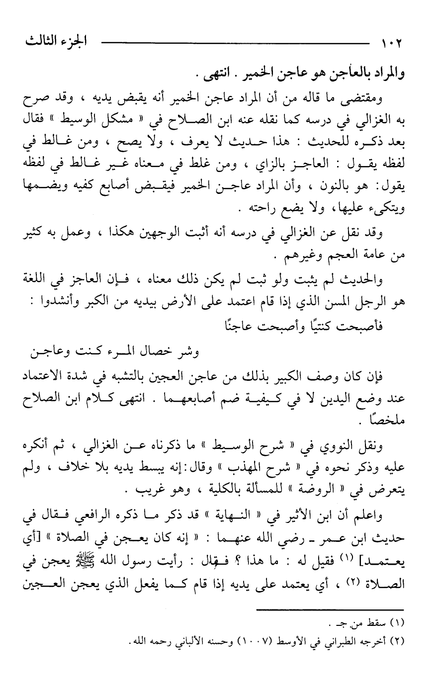 ومقتضى ما قاله من أن المراد عاجن الخمير أنه يقبض يديه، وقد صرح به الغزالي في درسه كما نقله عنه ابن الصلاح في "مشكل الوسيط" فقال بعد ذكره للحديث: هذا حديث لا يعرف، ولا يصح، ومن غالط في لفظه يقول: العاجز بالزاي، ومن غلط في معناه غير غالط في لفظه يقول: هو بالنون، وأن المراد عاجن الخمير فيقبض أصابع كفيه ويضمها ويتكئ عليها، ولا يضع راحته.