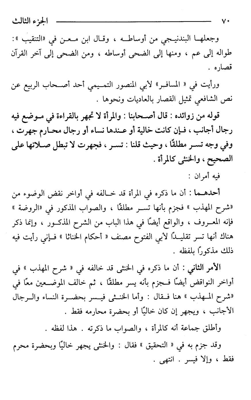قوله من زوائده: قال أصحابنا: والمرأة لا تجهر بالقراءة في موضع فيه رجال أجانب، فإن كانت خالية أو عندها نساء أو رجال محارم جهرت، وفي وجه تسر مطلقًا، وحيث قلنا: تسر، فجهرت لا تبطل صلاتها على الصحيح، والخنثى كالمرأة.