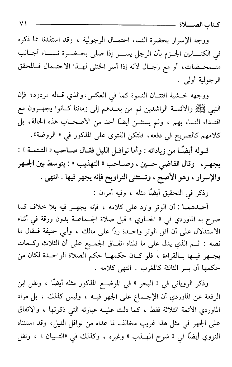 أحدهما: أن الوتر وارد على كلامه، فإنه يجهر فيه بلا خلاف كما صرح به الماوردي في "الحاوي" قبل صلاة الجماعة بدون ورقة في أثناء الاستدلال على أن أقل الوتر واحدة ردًا على مالك، وأبي حنيفة فقال ما نصه: ثم الذي يدل على ما قلناه اتفاق الجميع على أن الثلاث ركعات يجهر فيها بالقراءة، فلو كان حكمها حكم الصلاة الواحدة لكان من حكمها أن يسر الثالثة كالمغرب. انتهى كلامه.