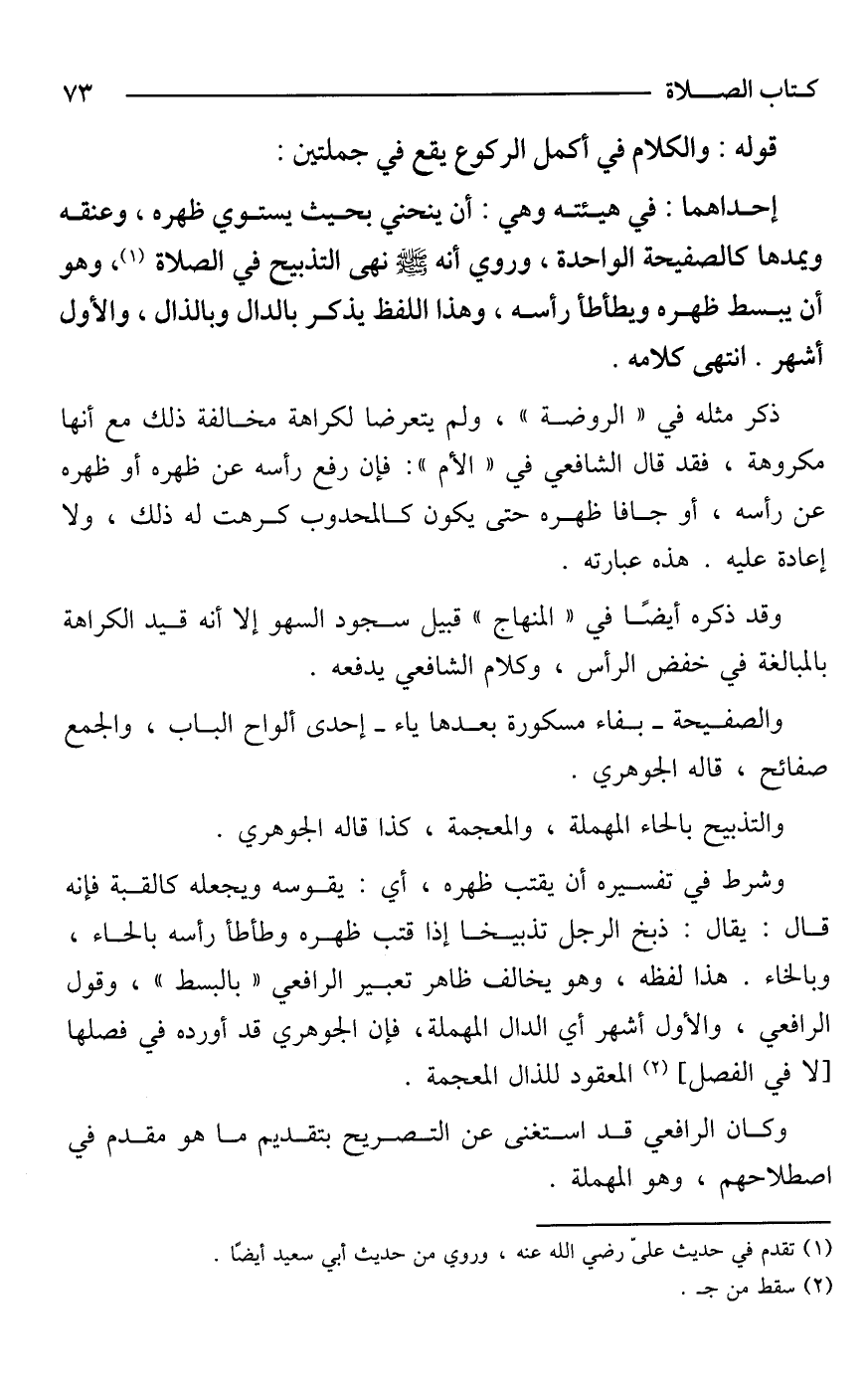 إحداهما: في هيئته وهي: أن ينحني بحيث يستوي ظهره، وعنقه ويمدها كالصفيحة الواحدة، وروي أنه - صَلَّى اللَّهُ عَلَيْهِ وَسَلَّمَ - نهى التذبيح في الصلاة (¬1)، وهو أن يبسط ظهره ويطأطأ رأسه، وهذا اللفظ يذكر بالدال وبالذال، والأول أشهر. انتهى كلامه.