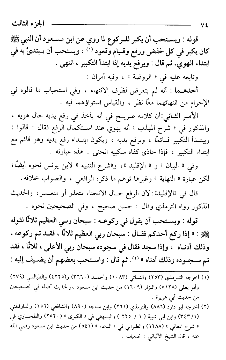 قوله: ويستحب أن يكبر للركوع لما روي عن ابن مسعود أن النبي - صَلَّى اللَّهُ عَلَيْهِ وَسَلَّمَ - كان يكبر في كل خفض ورفع وقيام وقعود (¬1)، ويستحب أن يبتدئ به في ابتداء الهوي، ثم قال: ويرفع يديه إذا ابتدأ التكبير، انتهى.