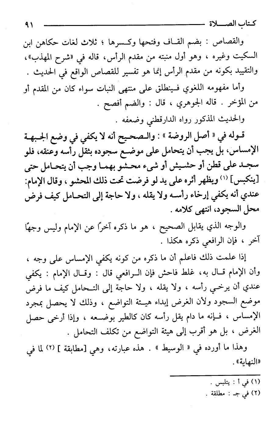 قوله في "أصل الروضة": والصحيح أنه لا يكفي في وضع الجبهة الإمساس، بل يجب أن يتحامل على موضع سجوده بثقل رأسه وعنقه، فلو سجد على قطن أو حشيش أو شئ محشو بهما وجب أن يتحامل حتى [ينكبس] (¬1) ويظهر أثره على يد لو فرضت تحت ذلك المحشو، وقال الإمام: عندي أنه يكفي إرخاء رأسه ولا يقله، ولا حاجة إلى التحامل كيف فرض محل السجود، انتهى كلامه.