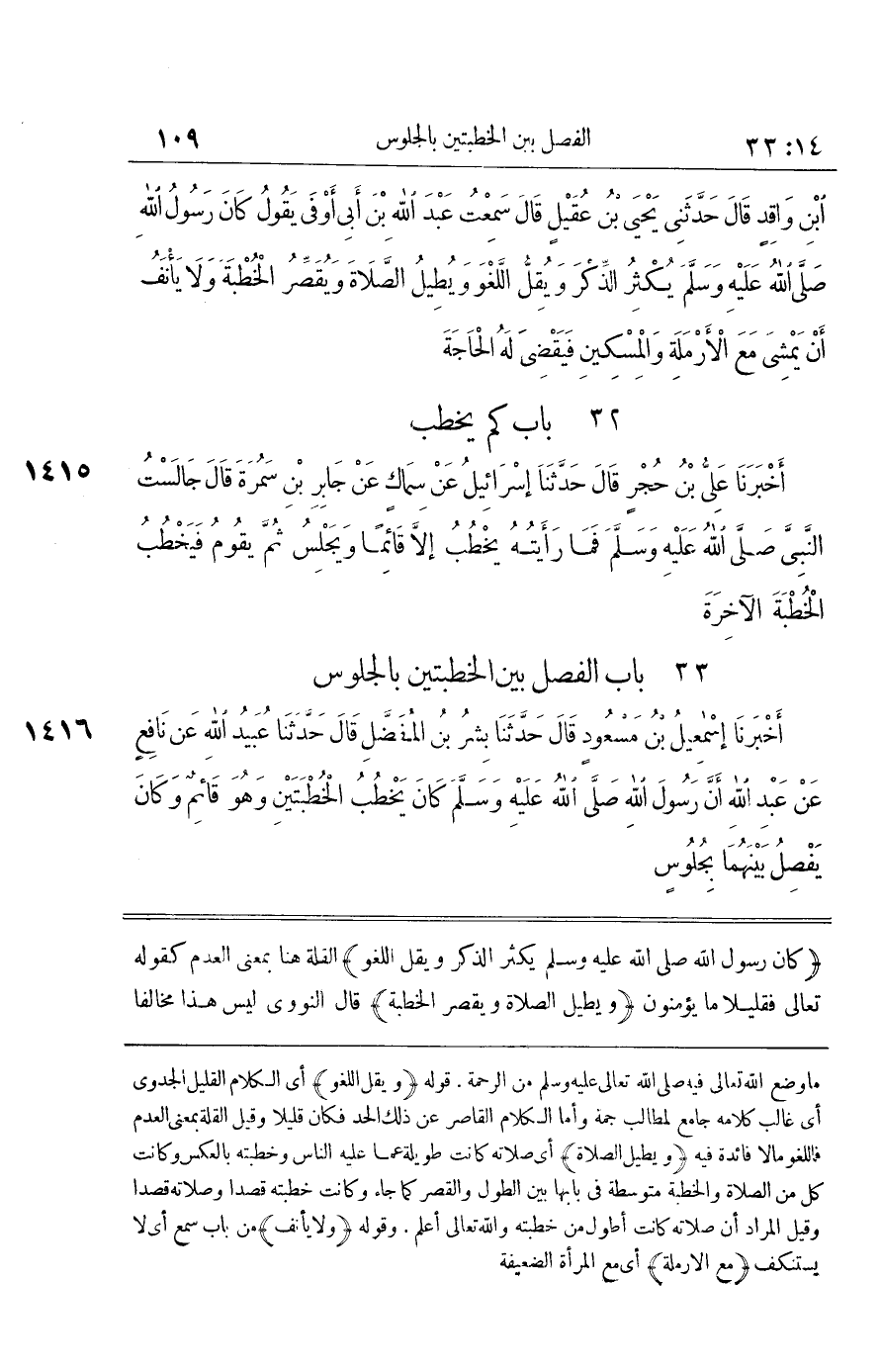 [1414] ويقل اللَّغْو أَي الْكَلَام الْقَلِيل الجدوى أَي غَالب كَلَامه جَامع لمطالب جمة وَأما الْكَلَام الْقَاصِر عَن ذَلِك الْحَد فَكَانَ قَلِيلا وَقيل الْقلَّة بِمَعْنى الْعَدَم فاللغو مَالا فَائِدَة فِيهِ ويطيل الصَّلَاة أَي صلَاته كَانَت طَوِيلَة عَمَّا عَلَيْهِ النَّاس وخطبته بِالْعَكْسِ وَكَانَت كل من الصَّلَاة وَالْخطْبَة متوسطة فِي بَابهَا بَين الطول وَالْقصر كَمَا جَاءَ وَكَانَت خطبَته قصدا وَصلَاته قصدا وَقيل المُرَاد أَن صلَاته كَانَت أطول من خطبَته وَالله تَعَالَى أعلم وَقَوله وَلَا يأنف من بَاب سمع أَي لَا يستنكف مَعَ الارملة أَي مَعَ الْمَرْأَة الضعيفة قَوْله قصدا أَي متوسطة بَين الْقصر والطول وَكَذَا الصَّلَاة وَلَا يلْزم مساواتهما إِذْ توَسط كل يعْتَبر فِي بَابه كَمَا تقدم قَوْله