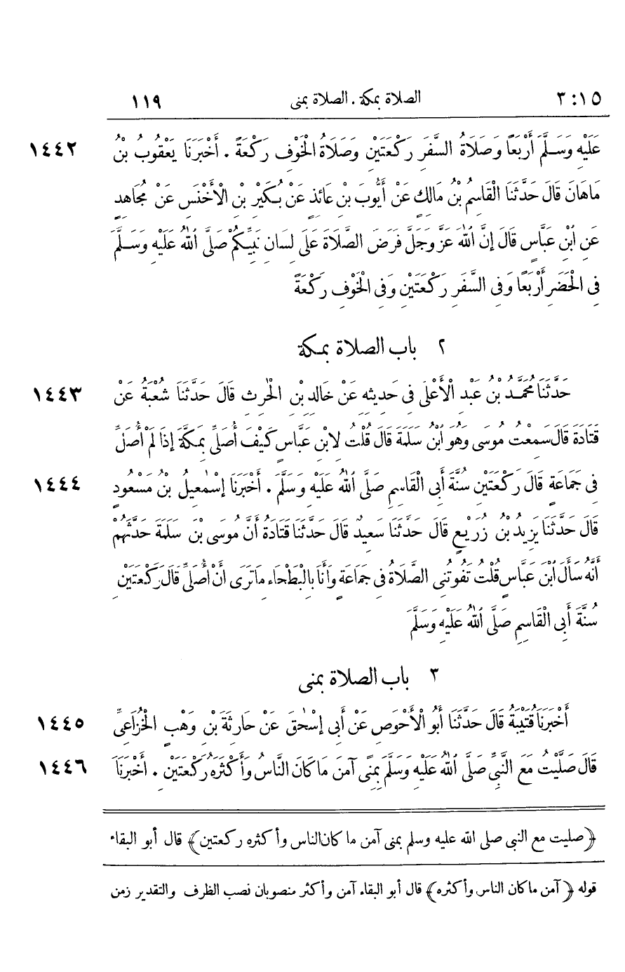 [1445] صَلَّيْتُ مَعَ النَّبِيِّ صَلَّى اللَّهُ عَلَيْهِ وَسَلَّمَ بِمِنًى آمَنَ مَا كَانَ النَّاسُ وَأَكْثَرُهُ رَكْعَتَيْنِ قَالَ أَبُو الْبَقَاءِ آمَنَ وَأَكْثَرُ مَنْصُوبَانِ نَصْبَ الظَّرْفِ وَالتَّقْدِيرُ زَمَنَ آمَنَ فَحَذَفَ الْمُضَافُ وَأَقَامَ الْمُضَاف إِلَيْهِ مقَامه أَي أَكثر نون النَّاسِ وَأَمَّا وَأَكْثَرُهُ فَعَائِدٌ إِلَى جِنْسِ النَّاسِ وَهُوَ مُفْرد
