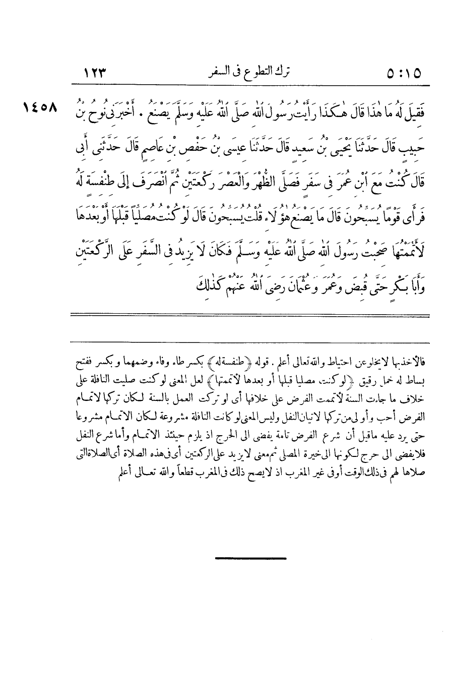 [1458] طنفسة لَهُ بِكَسْر طاء وَفَاء وضمهما وبكسر فَفتح بِسَاط لَهُ خمل رَقِيق لَوْ كُنْتُ مُصَلِّيًا قَبْلَهَا أَوْ بَعْدَهَا لَأَتْمَمْتُهَا لَعَلَّ الْمَعْنى لَو كنت صليت النَّافِلَة على خلاف مَا جَاءَت السّنة لأتممت الْفَرْض على خلَافهَا أَي لَو تركت الْعَمَل بِالسنةِ لَكَانَ تَركهَا لاتمام الْفَرْض أحب وَأولى من تَركهَا لاتيان النَّفْل وَلَيْسَ الْمَعْنى لَو كَانَت النَّافِلَة مَشْرُوعَة لَكَانَ الاتمام مَشْرُوعا حَتَّى يرد عَلَيْهِ مَا قيل أَن شرع الْفَرْض تَامَّة يُفْضِي إِلَى الْحَرج إِذْ يلْزم حِينَئِذٍ الاتمام وَأما شرع النَّفْل فَلَا يُفْضِي إِلَى حرج لكَونهَا إِلَى خيرة الْمُصَلِّي ثمَّ معنى لَا يزِيد على الرَّكْعَتَيْنِ أَي فِي هَذِه الصَّلَاة أَي الصَّلَاة الَّتِي صلاهَا لَهُم فِي ذَلِك الْوَقْت أوفى غير الْمغرب إِذْ لَا يَصح ذَلِك فِي الْمغرب قطعا وَالله تَعَالَى أعلم