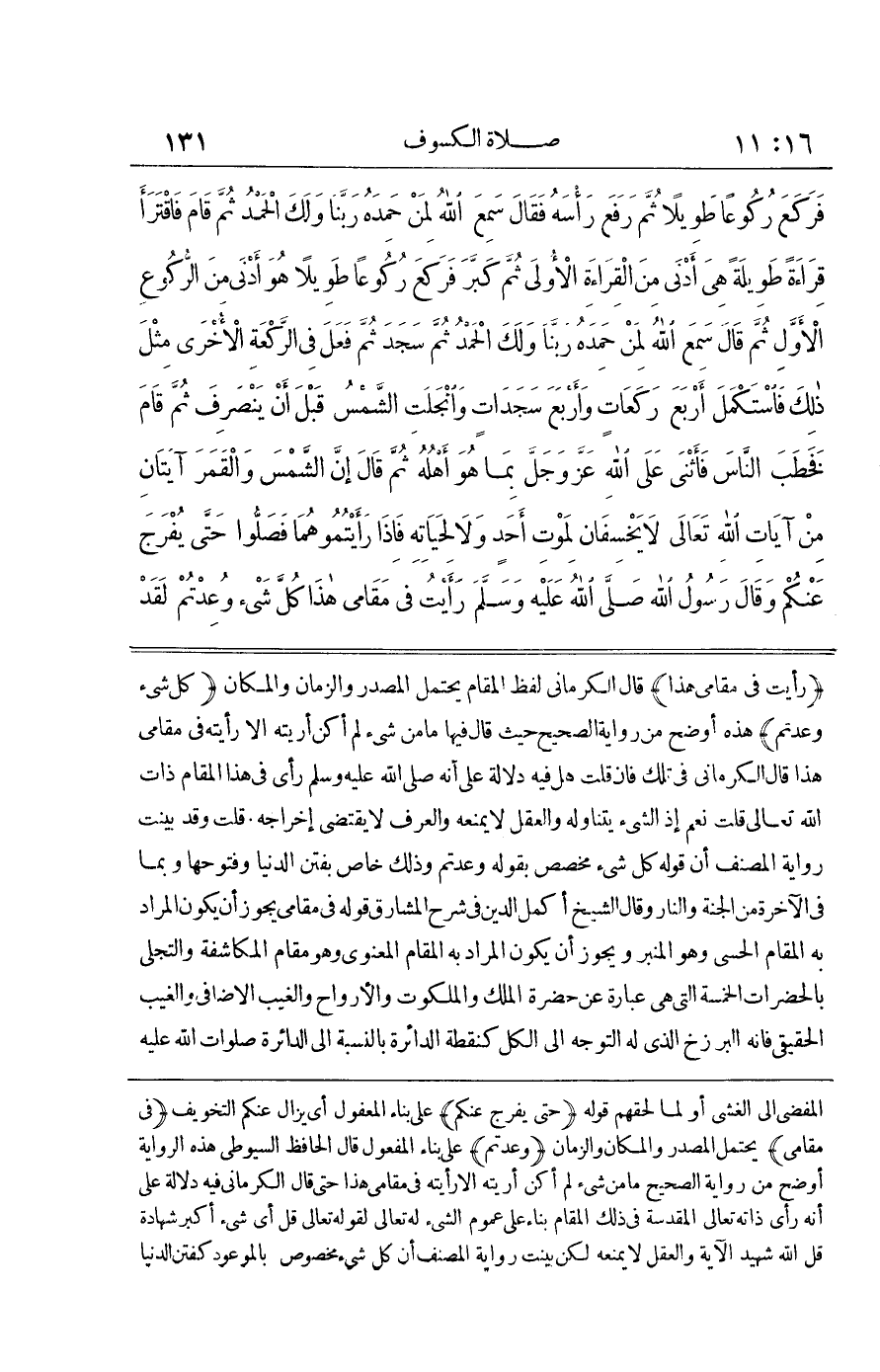 [1472] رَأَيْتُ فِي مَقَامِي هَذَا قَالَ الْكَرْمَانِيُّ لَفْظُ الْمَقَامِ يَحْتَمِلُ الْمَصْدَرَ وَالزَّمَانَ وَالْمَكَانَ كُلَّ شَيْءٍ وُعِدْتُمْ هَذِهِ أَوْضَحُ مِنْ رِوَايَةِ الصَّحِيحِ حَيْثُ قَالَ فِيهَا مَا مِنْ شَيْءٍ لَمْ أَكُنْ أُرِيتُهُ إِلَّا رَأَيْتُهُ فِي مَقَامِي هَذَا قَالَ الْكَرْمَانِيُّ فِي تَلِكَ فَإِنْ قُلْتَ هَلْ فِيهِ دَلَالَةٌ عَلَى أَنَّهُ صَلَّى اللَّهُ عَلَيْهِ وَسَلَّمَ رَأَى فِي هَذَا الْمَقَامِ ذَاتَ اللَّهِ تَعَالَى قُلْتُ نَعَمْ إِذِ الشَّيْءُ يَتَنَاوَلُهُ وَالْعَقْلُ لَا يَمْنَعُهُ وَالْعُرْفُ لَا يَقْتَضِي إِخْرَاجَهُ قُلْتُ وَقَدْ بَيَّنَتْ رِوَايَةُ الْمُصَنِّفِ أَنَّ قَوْلَهُ كُلَّ شَيْءٍ مُخَصَّصٌ بِقَوْلِهِ وُعِدْتُمْ وَذَلِكَ خَاصٌّ بِفِتَنِ الدُّنْيَا وَفُتُوحِهَا وَبِمَا فِي الْآخِرَةِ مِنَ الْجَنَّةِ وَالنَّارِ وَقَالَ الشَّيْخُ أَكْمَلُ الدِّينِ فِي شَرْحِ الْمَشَارِقِ قَوْلُهُ فِي مَقَامِي يَجُوزُ أَنْ يَكُونَ الْمُرَادُ بِهِ الْمَقَامَ الْحِسِّيَّ وَهُوَ الْمِنْبَرُ وَيَجُوزُ أَنْ يَكُونَ الْمُرَادُ بِهِ الْمَقَامَ الْمَعْنَوِيَّ وَهُوَ مَقَامُ الْمُكَاشَفَةِ وَالتَّجَلِّي بِالْحَضَرَاتِ الْخَمْسَةِ الَّتِي هِيَ عِبَارَةٌ عَنْ حَضْرَةِ الْمُلْكِ وَالْمَلَكُوتِ وَالْأَرْوَاحِ وَالْغَيْبِ الْإِضَافِيِّ وَالْغَيْبِ الْحَقِيقِيِّ فَإِنَّهُ الْبَرْزَخُ الَّذِي لَهُ التَّوَجُّهُ إِلَى الْكُلِّ كَنُقْطَةِ الدَّائِرَةِ بِالنِّسْبَةِ إِلَى الدَّائِرَةِ صَلَوَاتُ اللَّهِ عَلَيْهِ