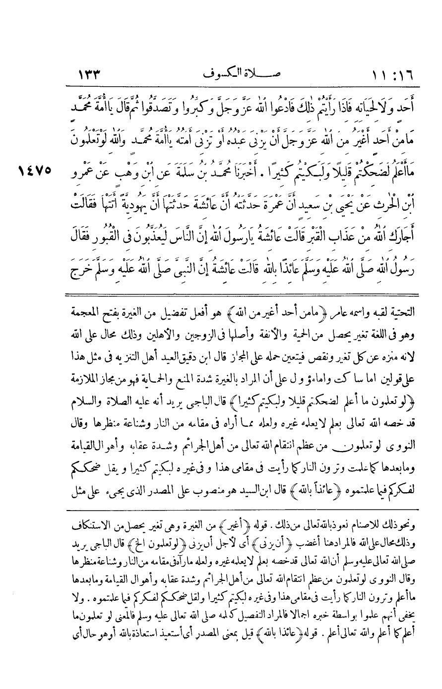 [1474] مَا مِنْ أَحَدٍ أَغْيَرُ مِنَ اللَّهِ هُوَ أَفْعَلُ تَفْضِيلٍ مِنَ الْغَيْرَةِ بِفَتْحِ الْمُعْجَمَةِ وَهُوَ فِي اللُّغَةِ تَغَيُّرٌ يَحْصُلُ مِنَ الْحَمِيَّةِ وَالْأَنَفَةِ وَأَصْلُهَا فِي الزَّوْجَيْنِ وَالْأَهْلِينَ وَذَلِكَ مُحَالٌ عَلَى اللَّهِ لِأَنَّهُ مُنَزَّهٌ عَنْ كُلِّ تَغَيُّرٍ وَنَقْصٍ فَيتَعَيَّن حمله على الْمجَاز قَالَ بن دَقِيقِ الْعِيدِ أَهْلُ التَّنْزِيهِ فِي مِثْلِ هَذَا عَلَى قَوْلَيْنِ إِمَّا سَاكِتٌ وَإِمَّا مُؤَوِّلٌ عَلَى أَنَّ الْمُرَادَ بِالْغَيْرَةِ شِدَّةُ الْمَنْعِ وَالْحِمَايَةُ فَهُوَ مِنْ مَجَازِ الْمُلَازَمَةِ لَوْ تَعْلَمُونَ مَا أَعْلَمُ لَضَحِكْتُمْ قَلِيلًا وَلَبَكَيْتُمْ كَثِيرًا قَالَ الْبَاجِيُّ يُرِيدُ أَنَّهُ عَلَيْهِ الصَّلَاةُ وَالسَّلَامُ قَدْ خَصَّهُ اللَّهُ تَعَالَى بِعِلْمٍ لَا يَعْلَمُهُ غَيْرُهُ وَلَعَلَّهُ مِمَّا أُرَاهُ فِي مَقَامِهِ مِنَ النَّارِ وَشَنَاعَةِ مَنْظَرِهَا وَقَالَ النَّوَوِيُّ لَوْ تَعْلَمُونَ مِنْ عِظَمِ انْتِقَامِ اللَّهِ تَعَالَى مِنْ أَهْلِ الْجَرَائِمِ وَشِدَّةِ عِقَابِهِ وَأَهْوَالِ الْقِيَامَةِ وَمَا بَعْدَهَا كَمَا عَلِمْتُ وَتَرَوْنَ النَّارَ كَمَا رَأَيْتُ فِي مَقَامِي هَذَا وَفِي غَيْرِهِ لَبَكَيْتُمْ كَثِيرًا وَيَقِلَّ ضَحِكُكُمْ لِفِكْرِكُمْ فِيمَا علمتموه