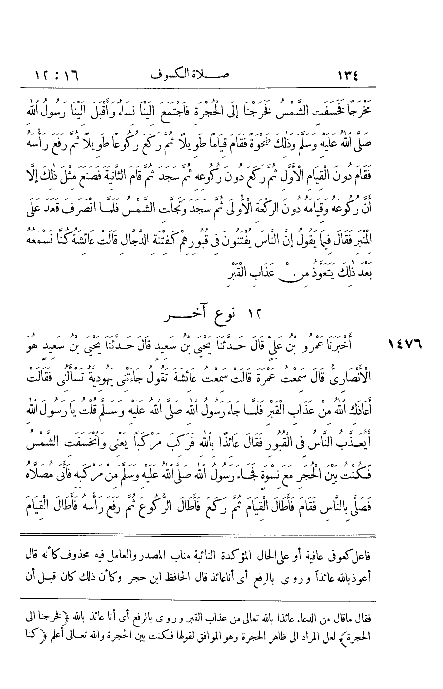 [1477] حَدثنَا عَبدة بن عبد الرَّحِيم أَنبأَنَا بن عُيَيْنَةَ عَنْ يَحْيَى بْنِ سَعِيدٍ عَنْ عَمْرَةَ عَنْ عَائِشَةَ أَنَّ رَسُولَ اللَّهِ صَلَّى اللَّهُ عَلَيْهِ وَسَلَّمَ صَلَّى فِي كُسُوفٍ فِي صُفَّةِ زَمْزَمَ أَرْبَعَ رَكَعَاتٍ فِي أَرْبَعِ سَجَدَاتٍ قَالَ الْحَافِظُ عِمَادُ الدِّينِ بْنُ كَثِيرٍ تَفَرَّدَ النَّسَائِيُّ عَن عُبَيْدَة بِقَوْلِهِ فِي صُفَّةِ زَمْزَمَ وَهُوَ وَهَمٌ بِلَا شَكٍّ فَإِنَّ رَسُولَ اللَّهِ صَلَّى اللَّهُ عَلَيْهِ وَسَلَّمَ لَمْ يُصَلِّ الْكُسُوفَ إِلَّا مَرَّةً وَاحِدَةً بِالْمَدِينَةِ فِي الْمَسْجِدِ هَذَا هُوَ الَّذِي ذَكَرَهُ الشَّافِعِي وَأحمد وَالْبُخَارِيّ وَالْبَيْهَقِيّ وبن عَبْدِ الْبَرِّ وَأَمَّا هَذَا الْحَدِيثُ بِهَذِهِ الزِّيَادَةِ فَيُخْشَى أَنْ يَكُونَ الْوَهَمُ مِنْ عَبْدَةَ بْنِ عَبْدِ الرَّحِيمِ هَذَا فَإِنَّهُ مَرْوَزِيٌّ نَزَلَ دِمَشْقَ ثُمَّ صَارَ إِلَى مِصْرَ فَاحْتَمَلَ أَنَّ النَّسَائِيَّ سَمِعَهُ مِنْهُ بِمِصْرَ فَدَخَلَ عَلَيْهِ