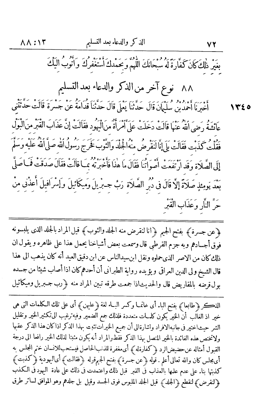 [1345] عَنْ جَسْرَةَ بِفَتْحِ الْجِيمِ إِنَّا لِنُقْرِضُ مِنْهُ الْجلد وَالثَّوْب قيل الْمُرَادُ بِالْجِلْدِ الَّذِي يَلْبَسُونَهُ فَوْقَ أَجْسَادِهِمْ وَبِهِ جَزَمَ الْقُرْطُبِيُّ قَالَ وَسَمِعْتُ بَعْضَ أَشْيَاخِنَا يَحْمِلُ هَذَا عَلَى ظَاهِرِهِ وَيَقُولُ إِنَّ ذَلِكَ كَانَ من الأصر الَّذِي حملوه وَنقل بن سيد النَّاس عَن بن دَقِيقِ الْعِيدِ أَنَّهُ كَانَ يَذْهَبُ إِلَى هَذَا قَالَ الشَّيْخُ وَلِيُّ الدِّينِ الْعِرَاقِيُّ وَيُؤَيِّدُهُ رِوَايَةُ الطَّبَرَانِيِّ أَنَّ أَحَدَهُمْ كَانَ إِذَا أَصَابَ شَيْئًا مِنْ جَسَدِهِ بَوْلٌ قَرَضَهُ بِالْمَقَارِيضِ قَالَ وَالْحَدِيثُ إِذَا جَمَعْتَ طُرُقَهُ تَبَيَّنَ الْمُرَادُ مِنْهُ رَبَّ جِبْرِيل وَمِيكَائِيل
