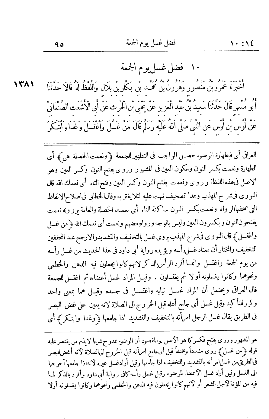 [1381] مَنْ غَسَلَ وَاغْتَسَلَ قَالَ النَّوَوِيُّ فِي شَرْحِ الْمُهَذَّبِ يُرْوَى غَسَلَ بِالتَّخْفِيفِ وَالتَّشْدِيدِ وَالْأَرْجَحُ عِنْدَ الْمُحَقِّقِينَ التَّخْفِيفُ وَالْمُخْتَارُ أَنَّ مَعْنَاهُ غَسَلَ رَأْسَهُ وَيُؤَيِّدُهُ رِوَايَةُ أَبِي دَاوُدَ فِي هَذَا الْحَدِيثِ مَنْ غَسَلَ رَأْسَهُ مِنْ يَوْمِ الْجُمُعَةِ وَاغْتَسَلَ وَإِنَّمَا أَفْرَدَ الرَّأْسَ بِالذِّكْرِ لِأَنَّهُمْ كَانُوا يَجْعَلُونَ فِيهِ الدُّهْنَ والْخِطْمِيَّ وَنَحْوَهُمَا وَكَانُوا يَغْسِلُونَهُ أَوَّلًا ثُمَّ يَغْتَسِلُونَ وَقِيلَ الْمُرَادُ غَسَلَ أَعْضَاءَهُ ثُمَّ اغْتَسَلَ لِلْجُمُعَةِ قَالَ الْعِرَاقِيُّ وَيَحْتَمِلُ أَنَّ الْمُرَادَ غَسَلَ ثِيَابَهُ وَاغْتَسَلَ فِي جَسَدِهِ وَقِيلَ هُمَا بِمَعْنًى وَاحِدٍ وَكَرَّرَ لِلتَّأْكِيدِ وَقِيلَ غَسَلَ أَيْ جَامَعَ أَهْلَهُ قَبْلَ الْخُرُوجِ إِلَى الصَّلَاةِ لِأَنَّهُ يُعِينُ عَلَى غَضِّ الْبَصَرِ فِي الطَّرِيقِ يُقَالُ غَسَلَ الرَّجُلُ امْرَأَتَهُ بِالتَّخْفِيفِ وَالتَّشْدِيدِ إِذَا جَامَعَهَا وَغَدَا وَابْتَكَرَ أَيْ