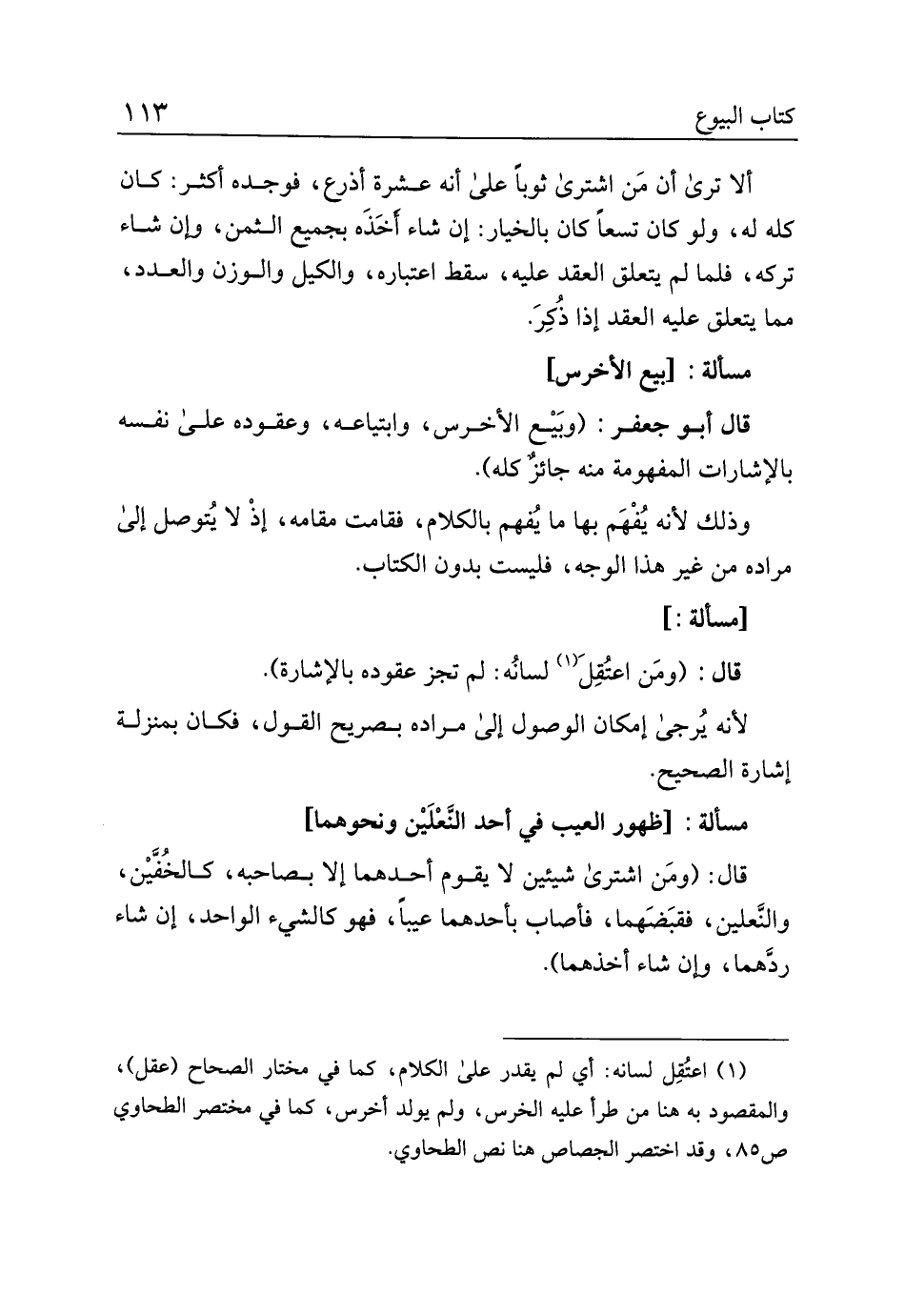 قال أبو جعفر: (وبيع الأخرس، وابتياعه، وعقوده على نفسه بالإشارات المفهومة منه جائز كله).