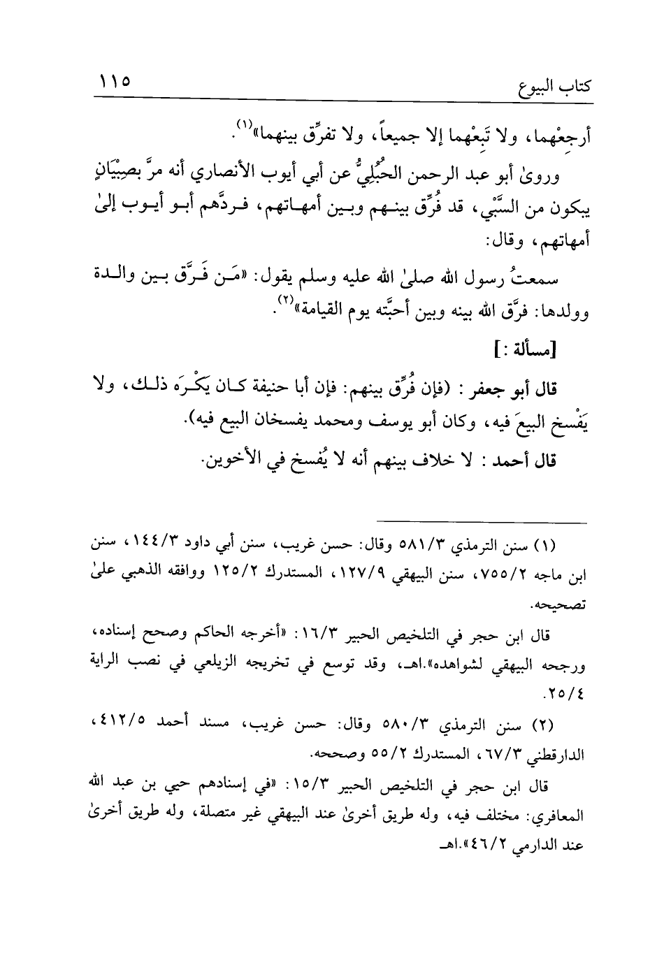 قال أبو جعفر: (فإن فرق بينهم: فإن أبا حنيفة كان يكره ذلك، ولا يفسخ البيع فيه، وكان أبو يوسف ومحمد يفسخان البيع فيه).