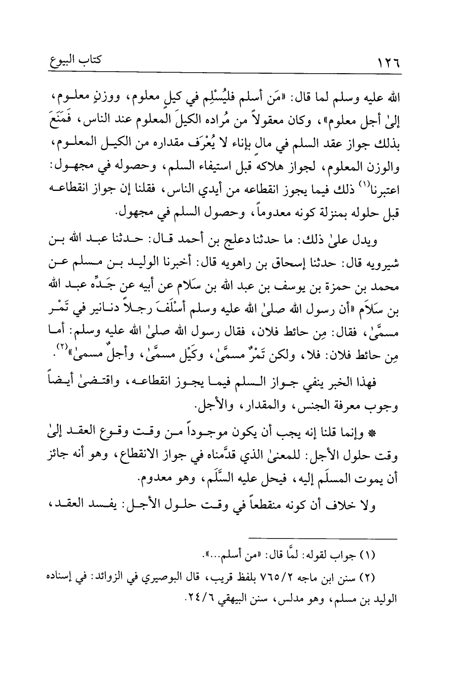 الله عليه وسلم لما قال: "من أسلم فليسلم في كيل معلوم، ووزن معلوم، إلى أجل معلوم"، وكان معقولا من مراده الكيل المعلوم عند الناس، فمنع بذلك جواز عقد السلم في مال بإناء لا يعرف مقداره من الكيل المعلوم، والوزن المعلوم، لجولا هلاكه قبل استيفاء السلم، وحصوله في مجهول: اعتبرنا ذلك فيما يجوز انقطاعه من أيدي الناس، فقلنا إن جواز انقطاعه قبل حلوله بمنزلة كونه معدوما، وحصول السلم في مجهول.