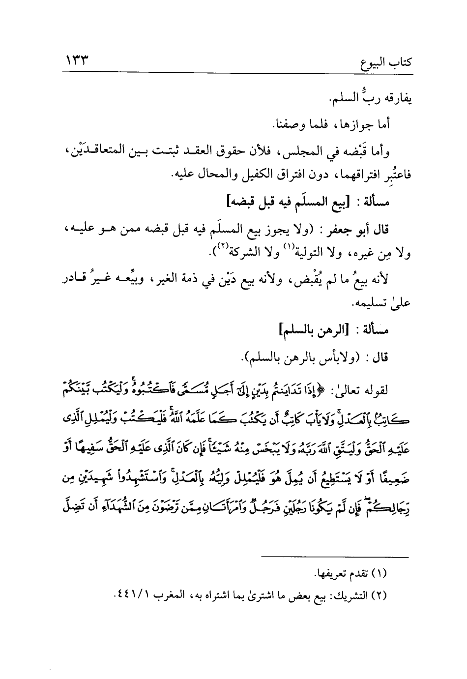 قال أبو جعفر: (ولا يجوز بيع المسلم فيه قبل قبضه ممن هو عليه، ولا من غيره، ولا التولية، ولا الشركة).