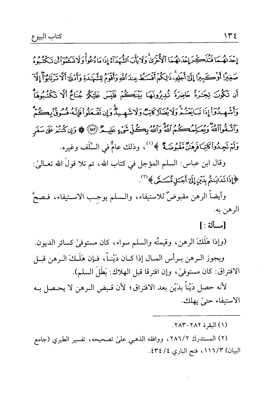 إحداهما فتذكر إحداهما الأخرى ولا يأب الشهداء إذا ما دعوا ولا تسئموا أن تكتبوه صفير أو كبيرا على اجله ذلكم أقسط عند الله وأقوم للشهادة وأدنى إلا ترتابوا إلا أن تكون تجارة حاضرة تديرونها بينكم فليس عليك جناح ألا تكتبوها وأشهدوا إذا تبايعتم ولا يضار كاتب ولا شهيد وإن تفعلوا فإنه فلوس بكم واتقوا الله ويعلمكم الله والله بكل شيء عليم وأن كنتم على سفر ولم تجدوا كاتبا فرهان مقبوضة}، وذلك عام في السلف وغيره.