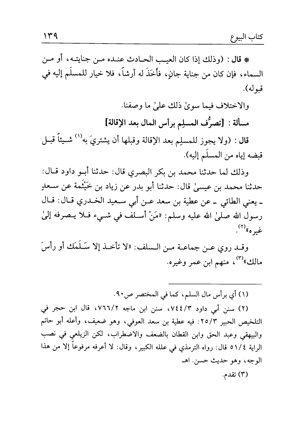 قال: (ولا يجوز للمسلم بعد الإقالة وقبلها أن يشتري به شيئا قبل قبضه إياه من المسلم إليه).