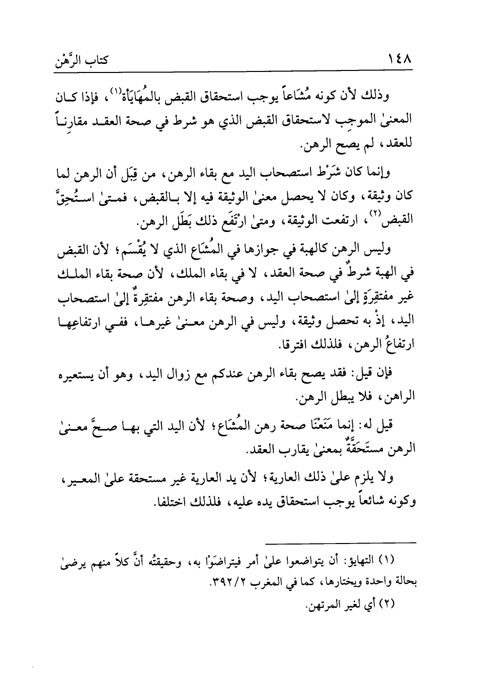 وليس الرهن كالهبة في جوازها في المشاع الذي لا يقسم؛ لأن القبض في الهبة شرط في صحة العقد، لا في بقاء الملك، لأن صحة بقاء الملك غير مفتقرة إلى استصحاب اليد، وصحة بقاء الرهن مفتقرة إلى استصحاب اليد، إذ به تحصل وثيقة، وليس في الرهن معني غيرها، ففي ارتفاعها ارتفاع الرهن، فلذلك افترقا.