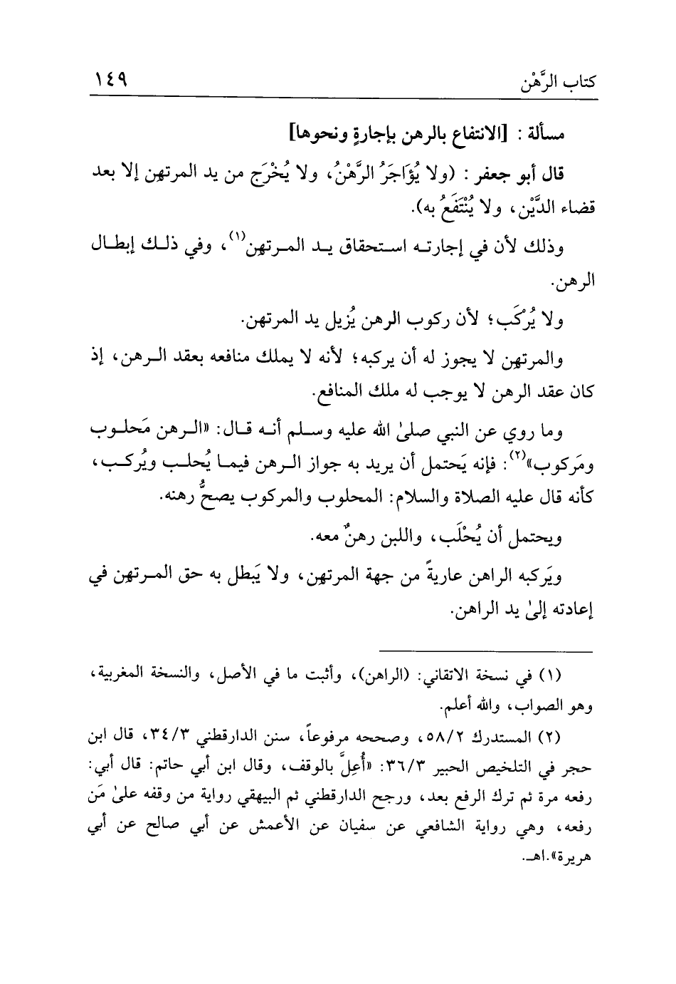 وما روي عن النبي صلى الله عليه وسلم أنه قال: "الرهن محلوب ومركوب": فإنه يحتمل أن يريد به جواز الرهن فيما يحلب ويركب، كأنه قال عليه الصلاة والسلام: المحلوب والمركوب يصح رهنه.