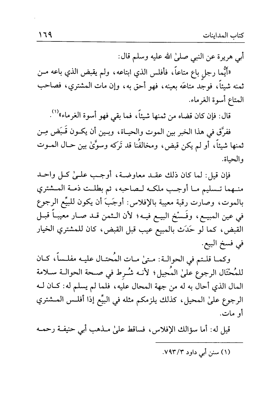 وكما لو قلتم في الحوالة: متى مات المحتال عليه مفلسا، كان للمحتال الرجوع على المحيل؛ لأنه شرط في صحة الحوالة سلامة المال الذي أحال به له من جهة المحال عليه، لما لم يسلم له: كان له الرجوع على المحيل، كذلك يلزمكم مثله في البيع إذا أفلس المشتري أو مات.