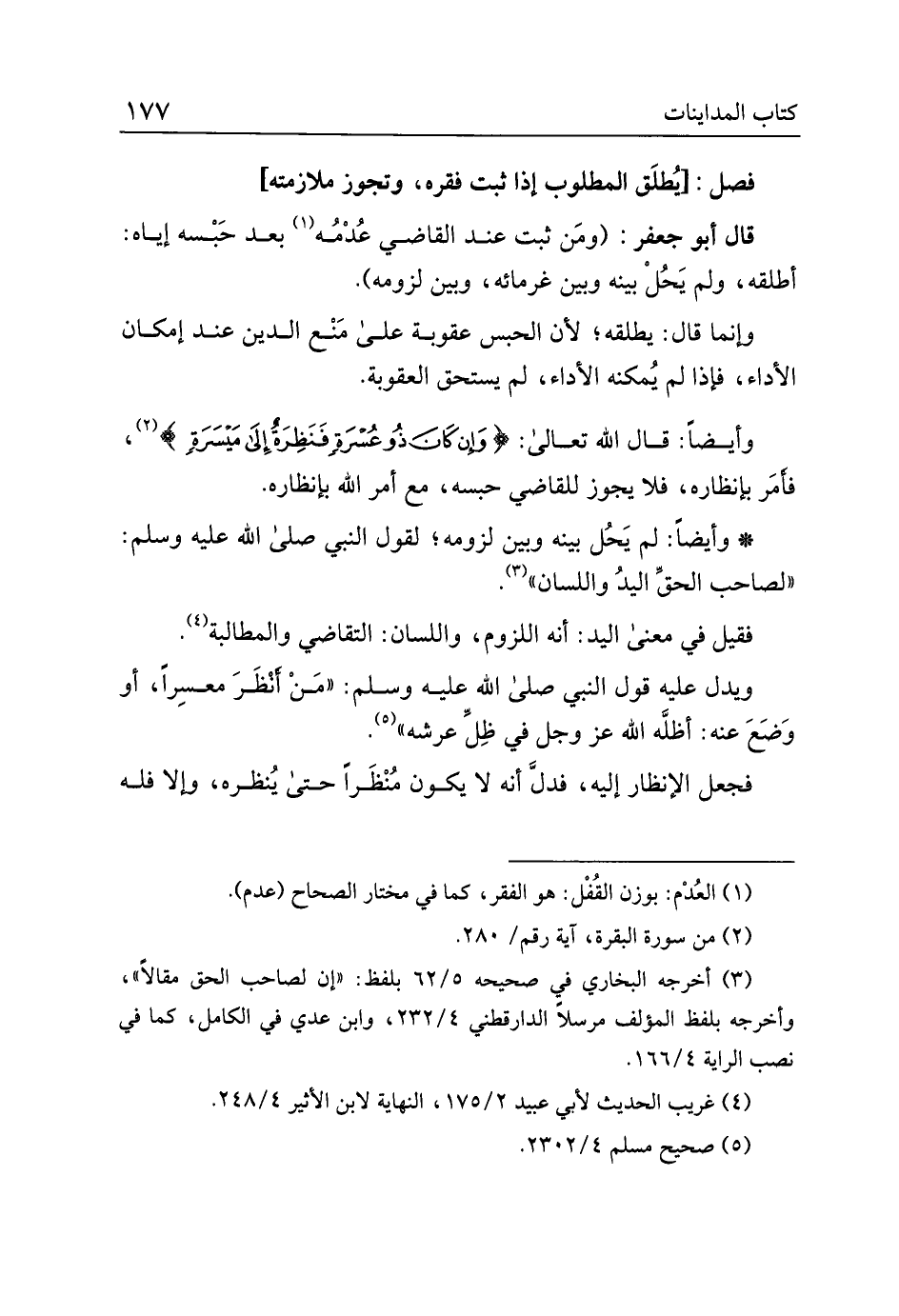 وأيضا: قال الله تعالى: {وإن كان ذو عسرة فنظرة إلى ميسرة}، فأمر بإنظاره، لا يجوز للقاضي حبسه، مع أمر الله بإنظاره.