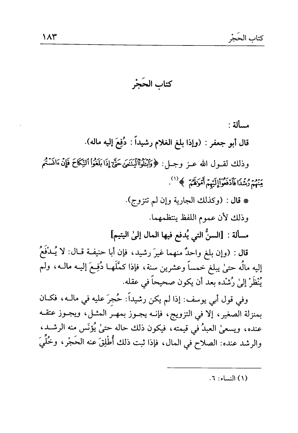 قال أبو جعفر: (وإذا بلغ الغلام رشيدا: دفع إليه ماله).