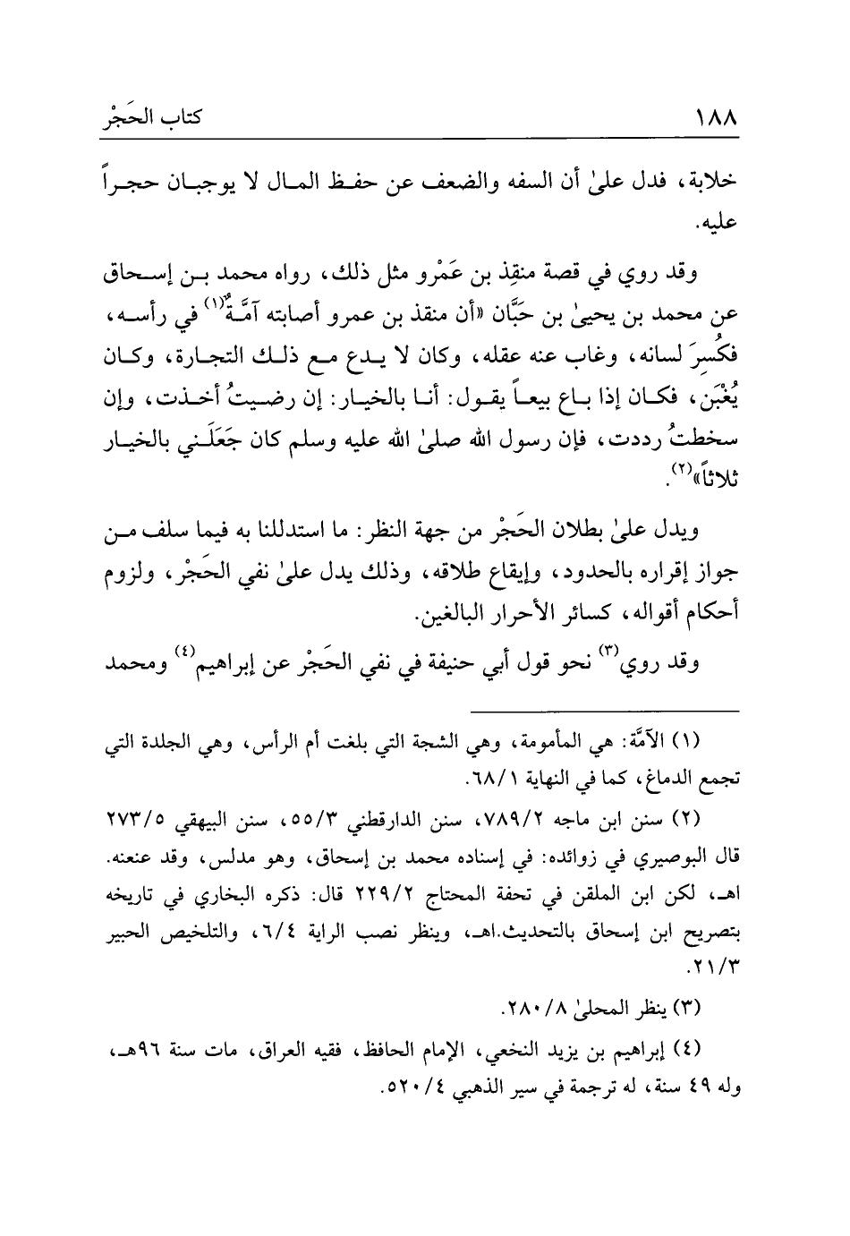 وقد روي في قصة منقذ بن عمرو مثل ذلك، رواه محمد بن إسحاق عن محمد بن يحيى بن حبان "أن منقذ بن عمرو أصابته آمة في رأسه، فكسر لسانه، وغاب عنه عقله، وكان لا يدع مع ذلك التجارة، وكان يغبن، فكان إذا باع بيعا يقول: أنا بالخيار: إن رضيت أخذت، وإن سخطت رددت، فإن رسول الله صلى الله عليه وسلم كان جعلني بالخيار ثلاثا".