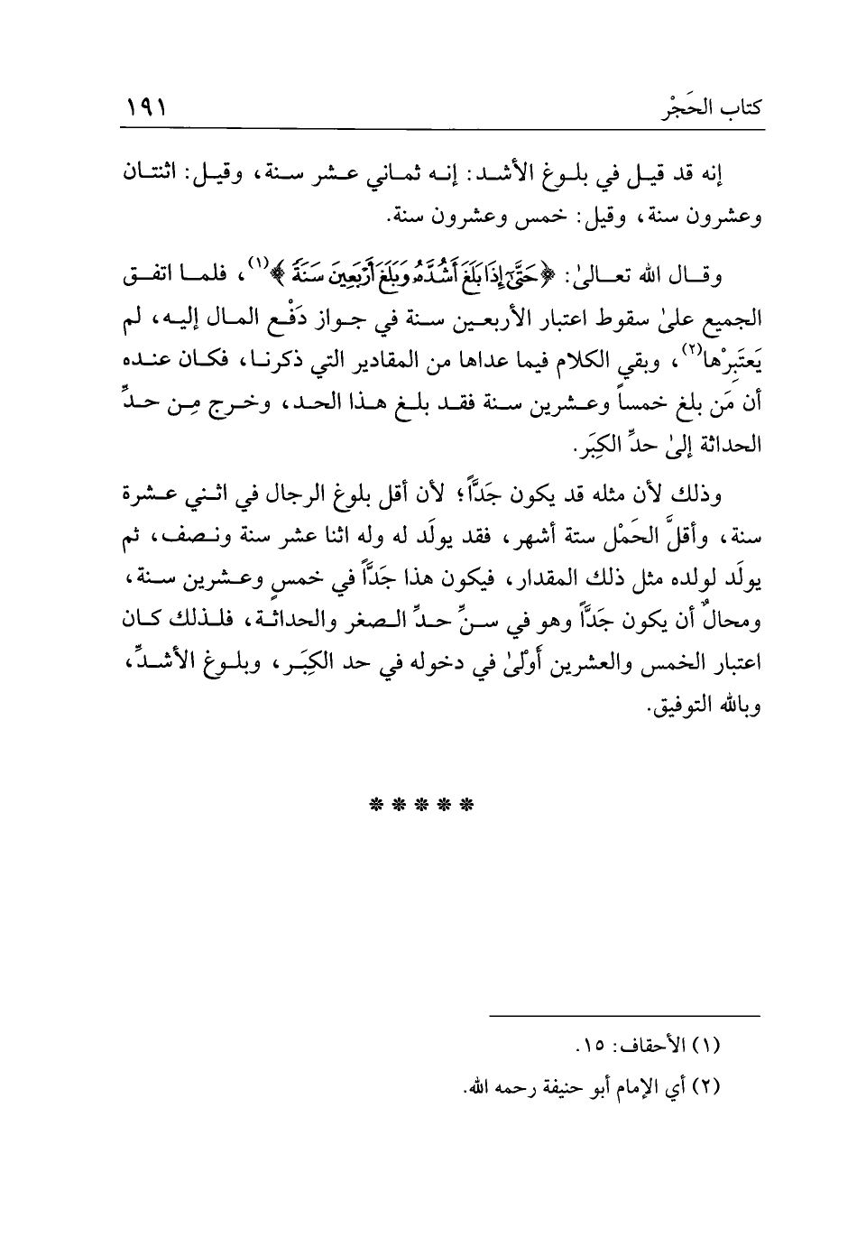 وقال الله تعالى: {حتى إذا بلغ أشده وبلغ أربعين سنة}، فلما اتفق الجميع على سقوط اعتبار الأربعين سنة في جواز دفع المال إليه، لم يعتبرها، وبقي الكلام فيما عداها من المقادير التي ذكرنا، فكان عنده أن من بلغ خمسا وعشرين سنة فقد بلغ هذا الحد، وخرج من حد الحداثة إلى حد الكبر.