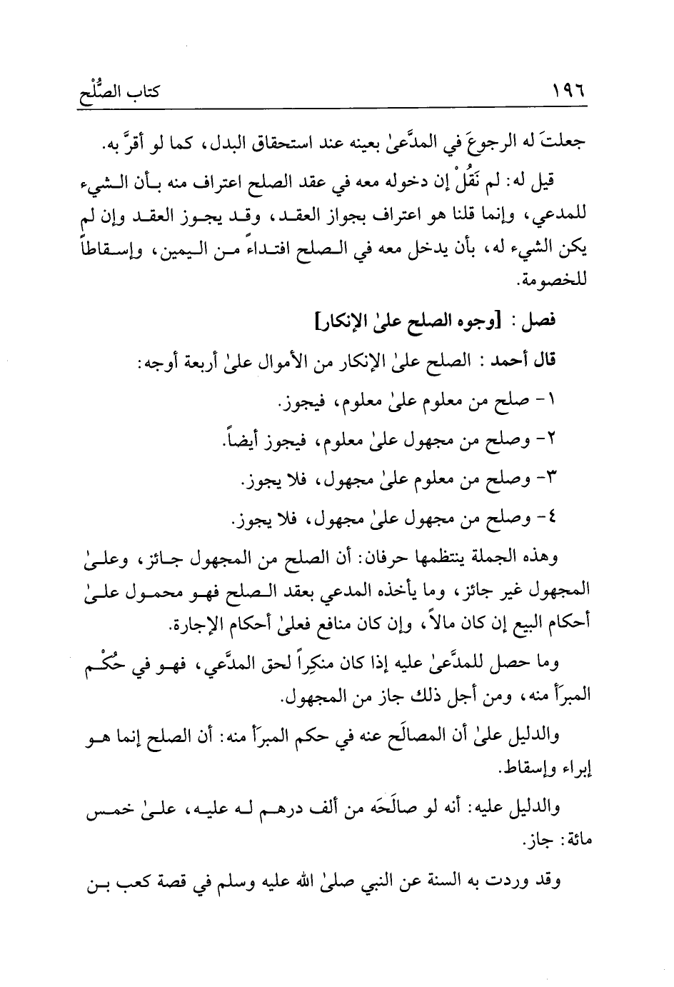 قال أحمد: الصلح على الإنكار من الاموال على أربعة أوجه: