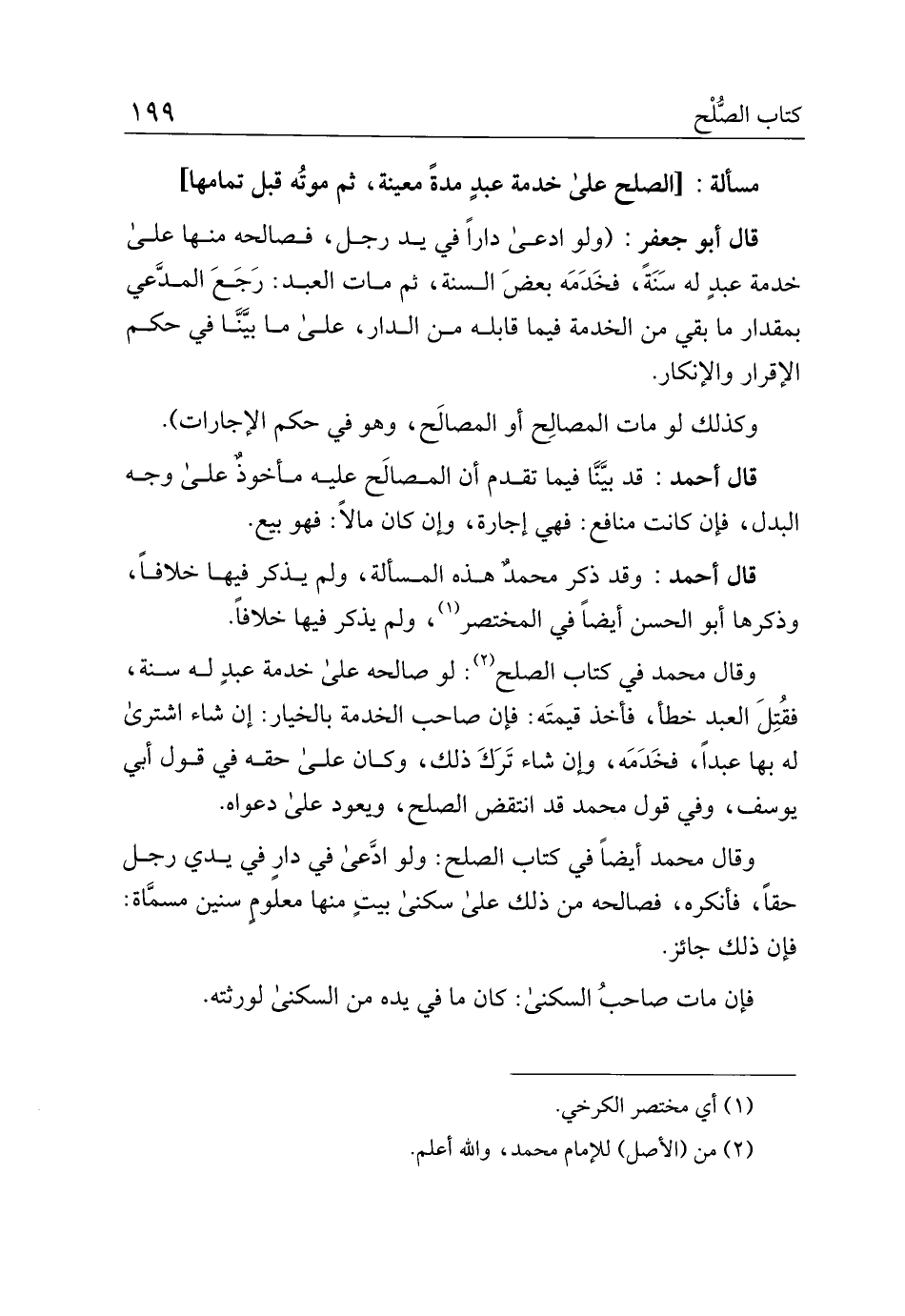 وقال محمد في كتاب الصلح: لو صالحه على خدمة عبد له سنة، فقتل العبد خطأ، فأخذ قيمته: فإن صاحب الخدمة بالخير: إن شاء اشترى له بها عبدا، فخدمه، وإن شاء ترك ذلك، وكان على حقه في قول أبي يوسف، وفي قول محمد قد انتقض الصلح، ويعود على دعواه.